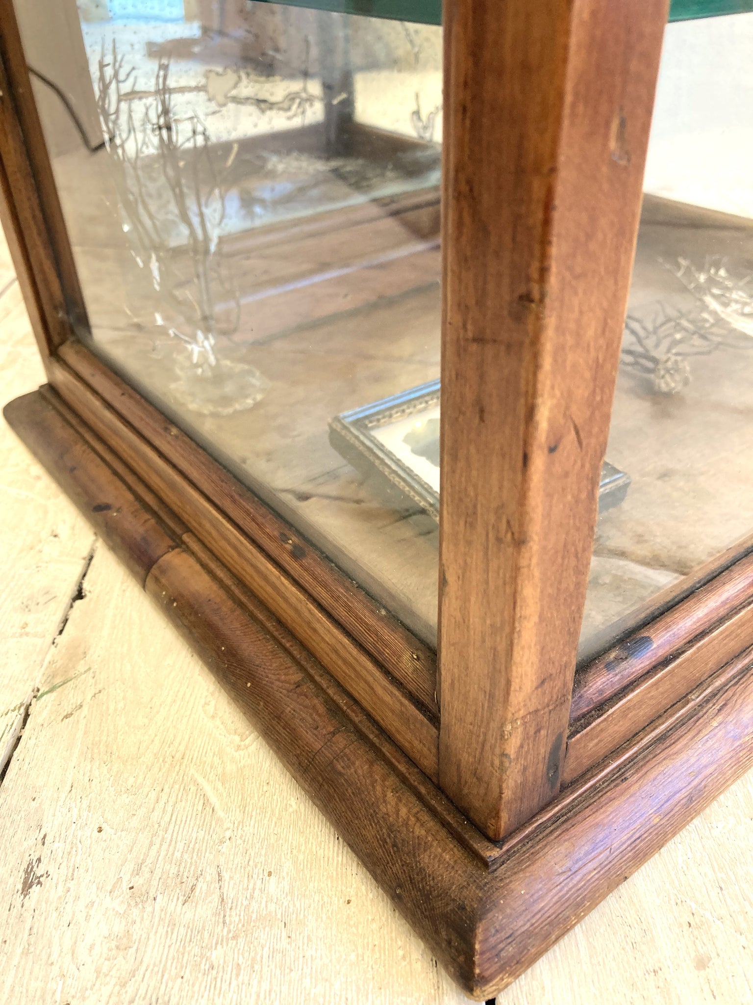 A stunning Victorian oak tabletop display cabinet with three glazed sides and a single glass shelf, but the really fabulous bit is the foxed mirrored back - it's just glorious!