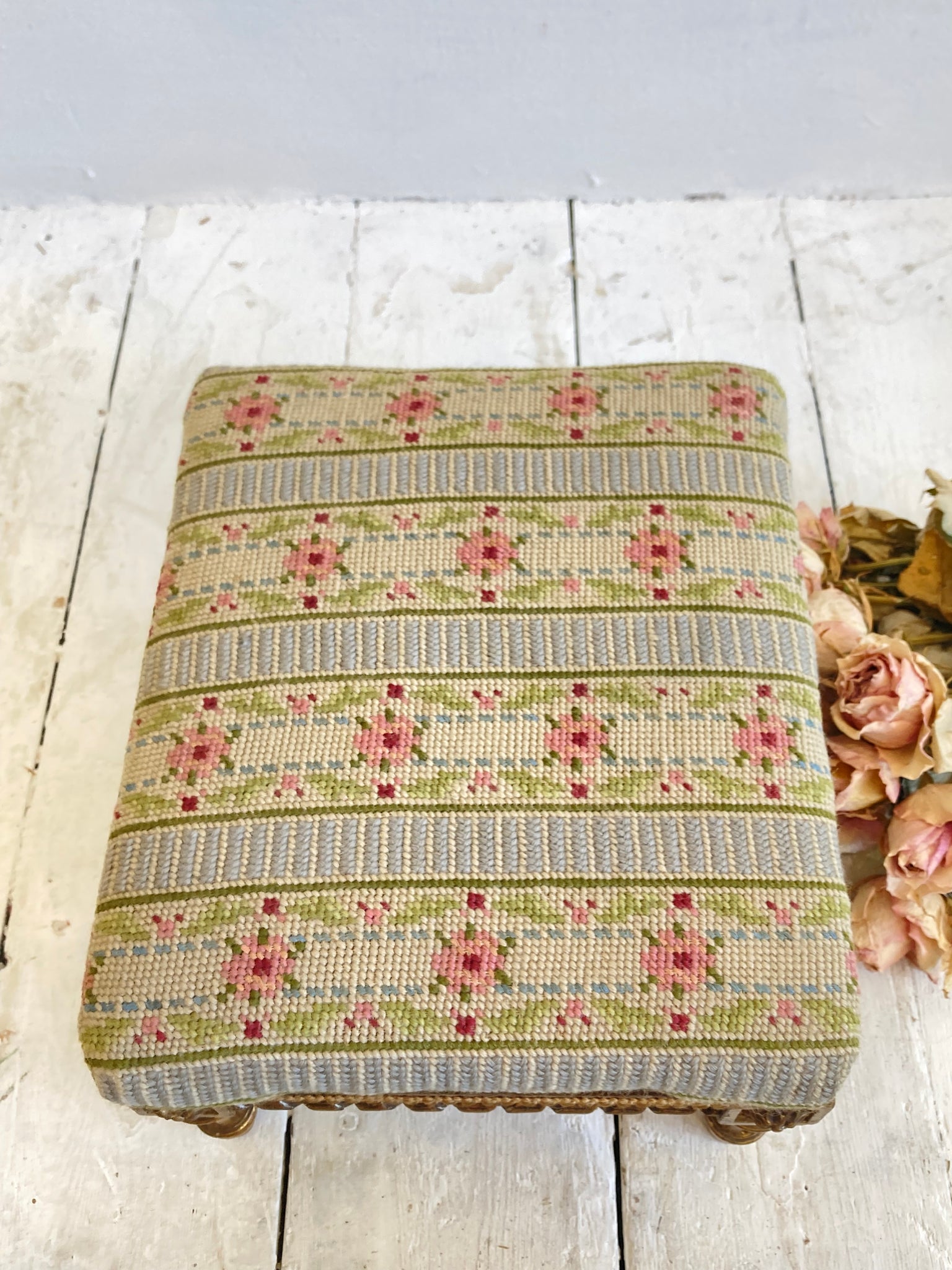The sweetest little antique French footstool - it's just so pretty! The frame is handcarved and gilded with traditional reeded legs and decorative patera in the corners; the top is covered in a lovely needle crafted design in pale blue, soft green and pink. The webbing underneath could do with a couple of stitches (see pic) otherwise this is in good antique condition.