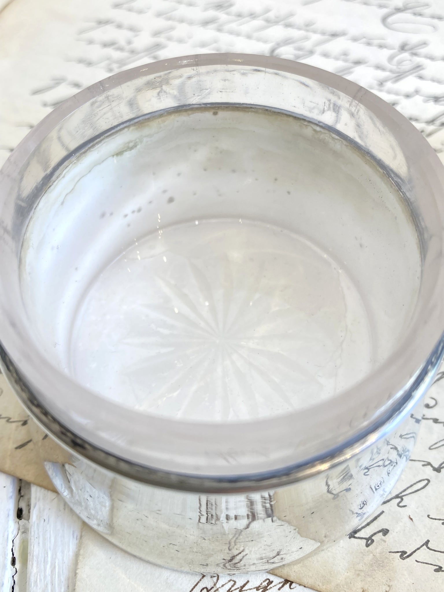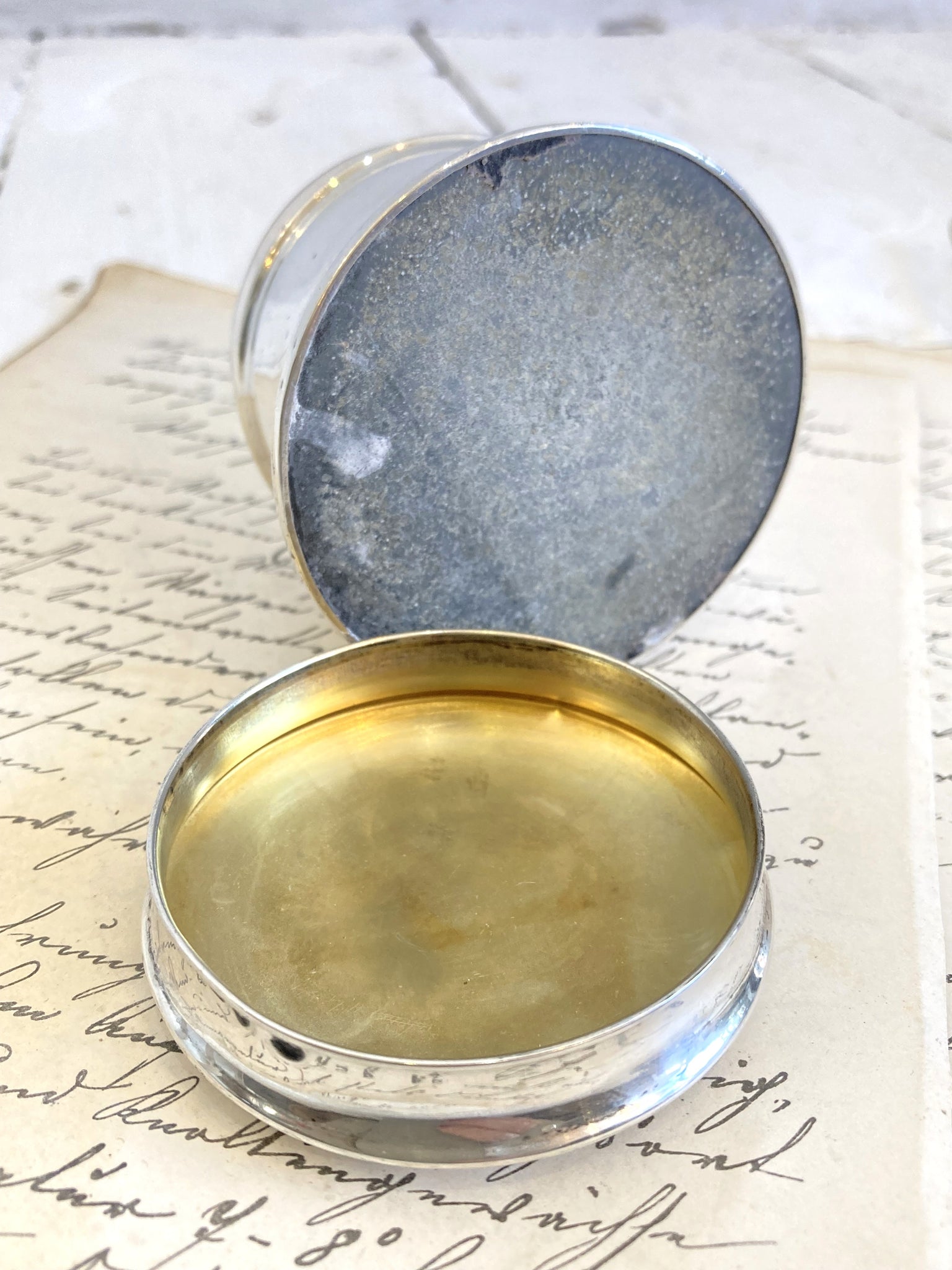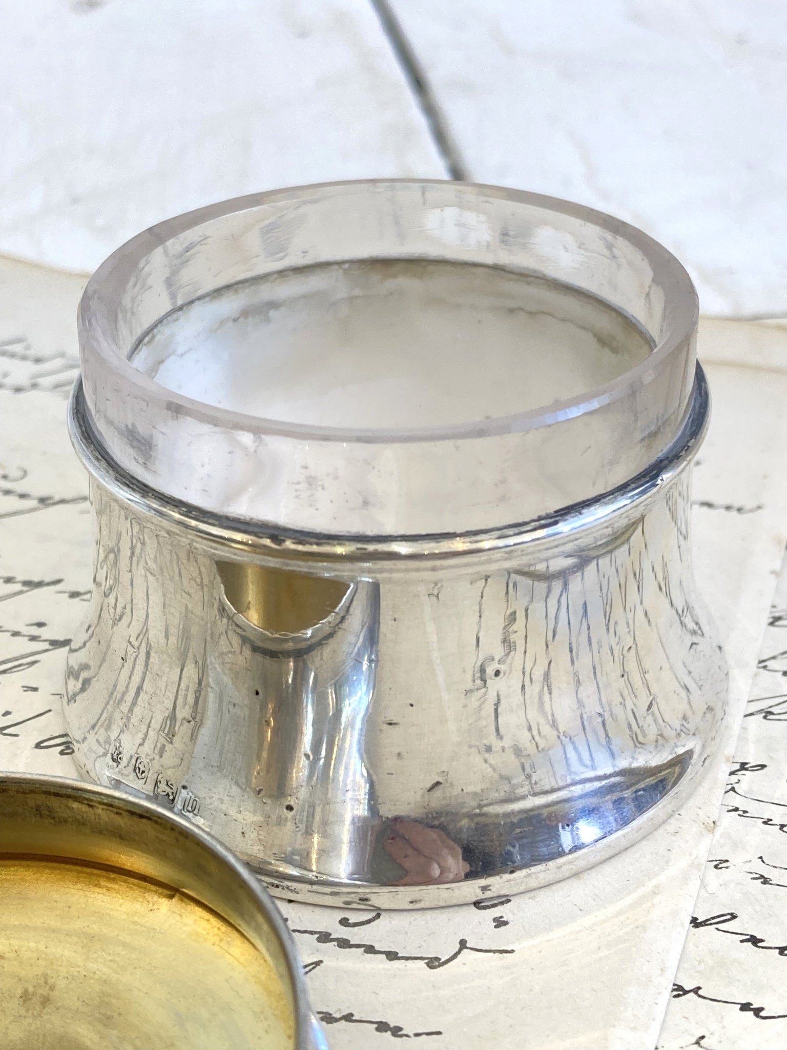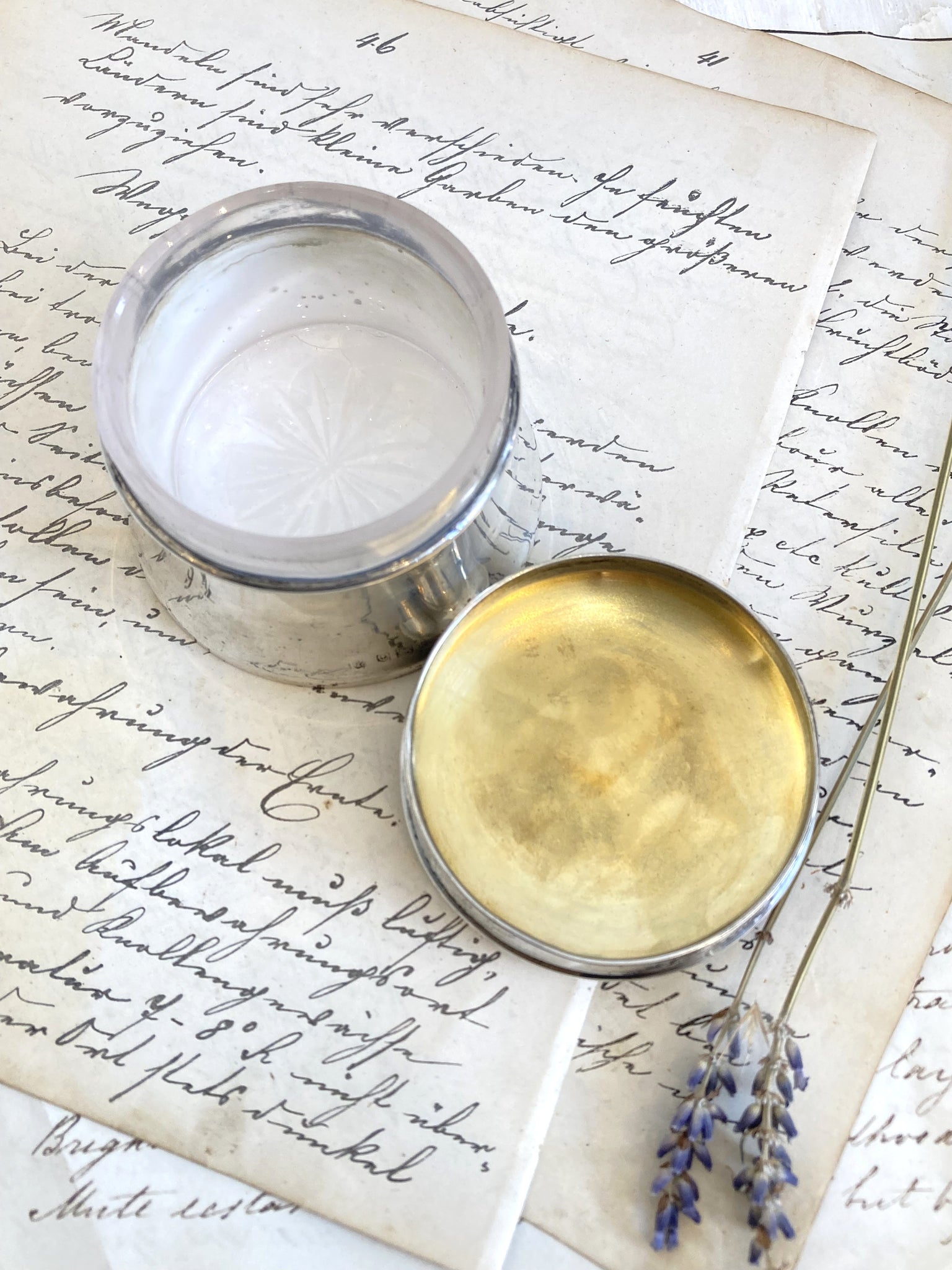 A beautiful sterling silver dressing table pot with original glass liner and gilded interior on the lid. Both the top and bottom have matching hallmarks for Birmingham 1912 and the pot is in good antique condition with no chips or cracks to the glass and the lid fits well.