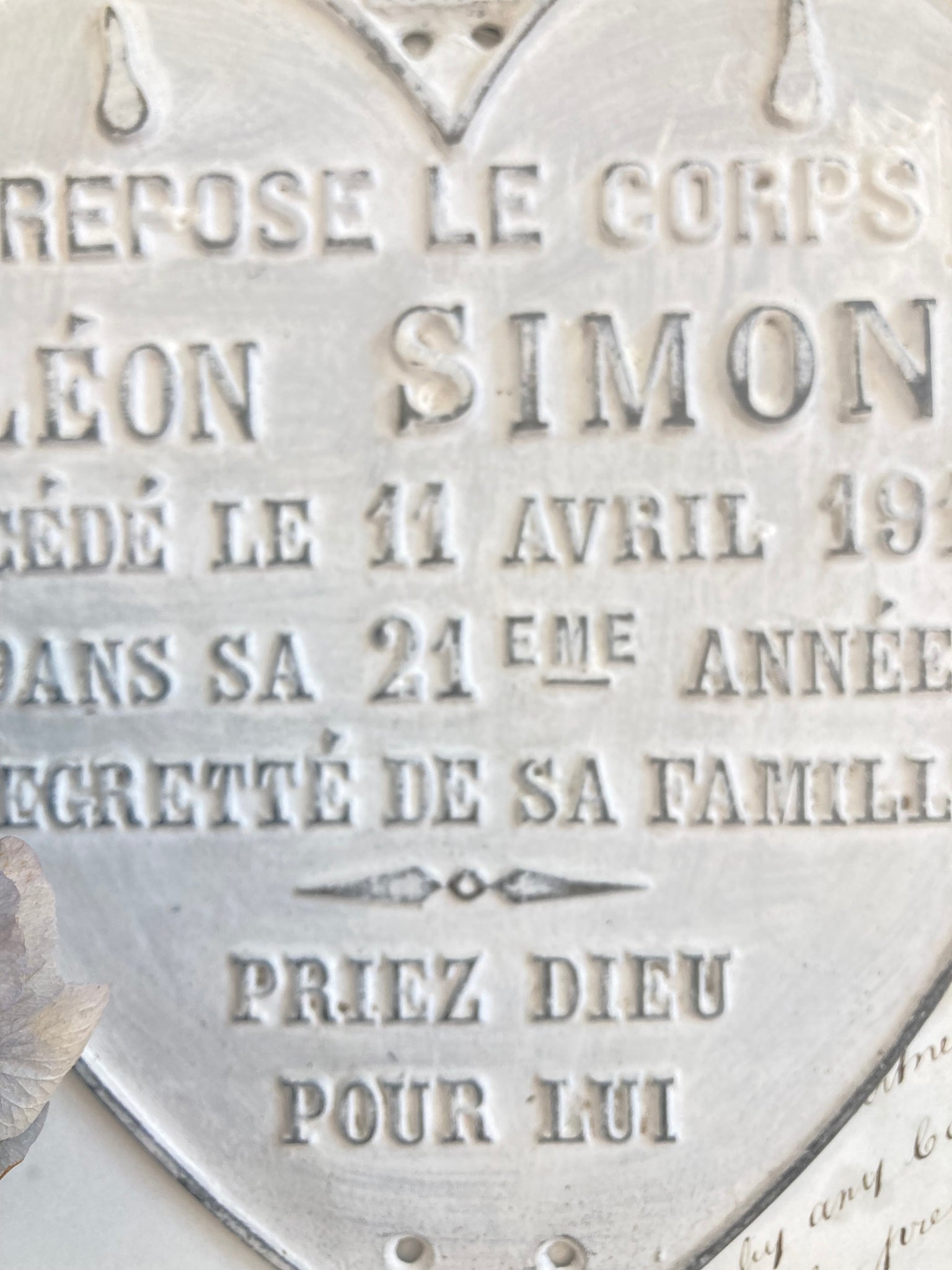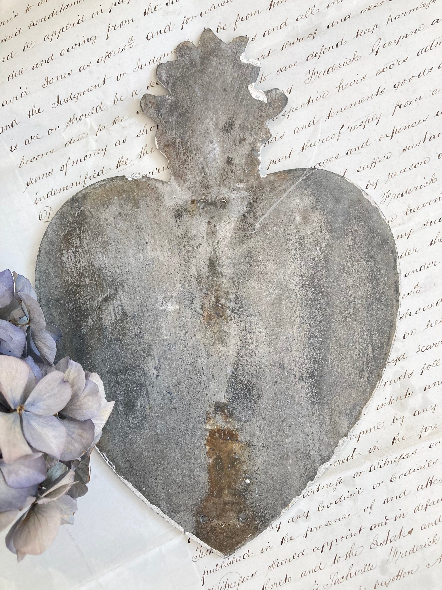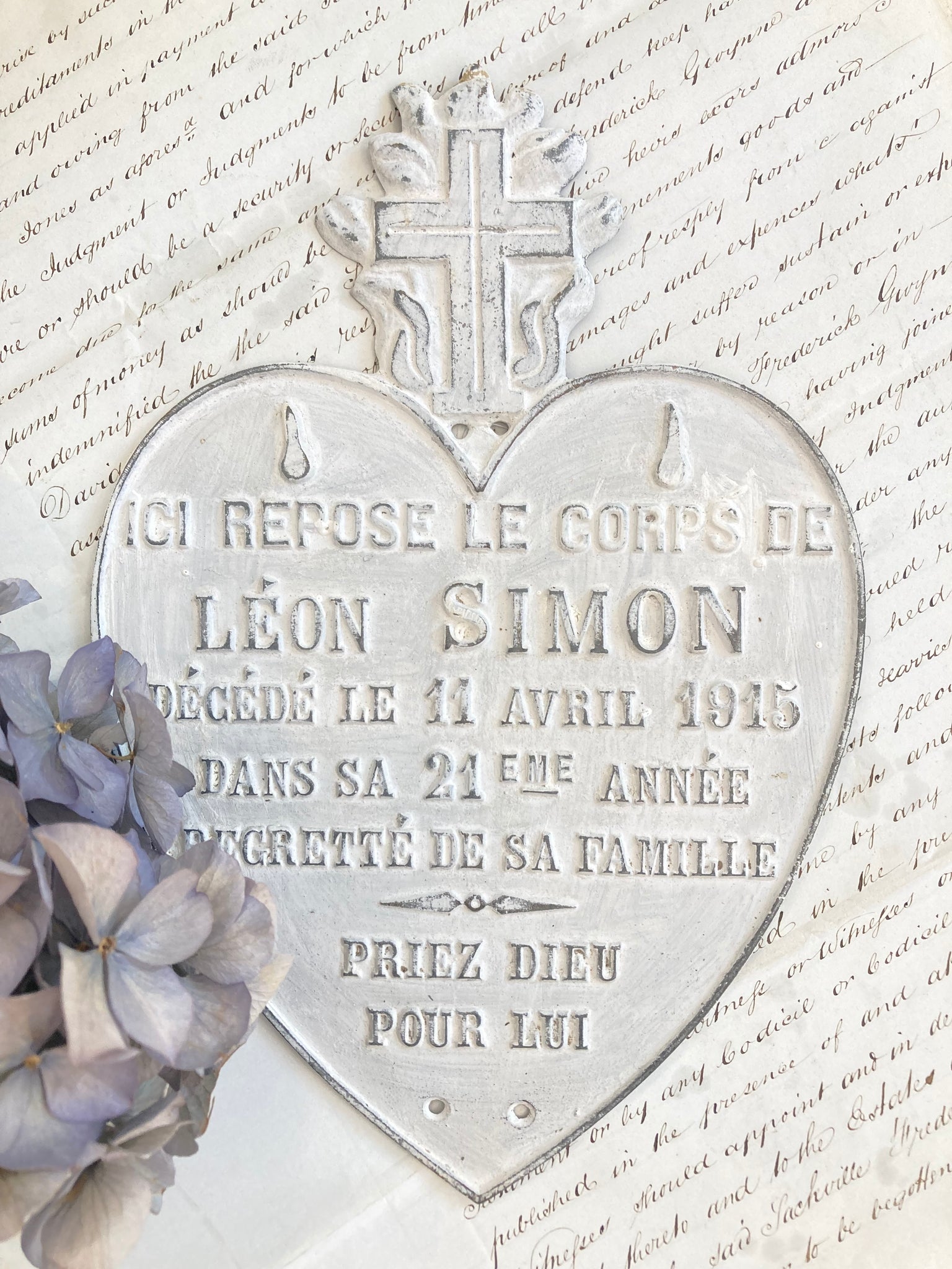 An antique French zinc memorial heart with raised typography.
