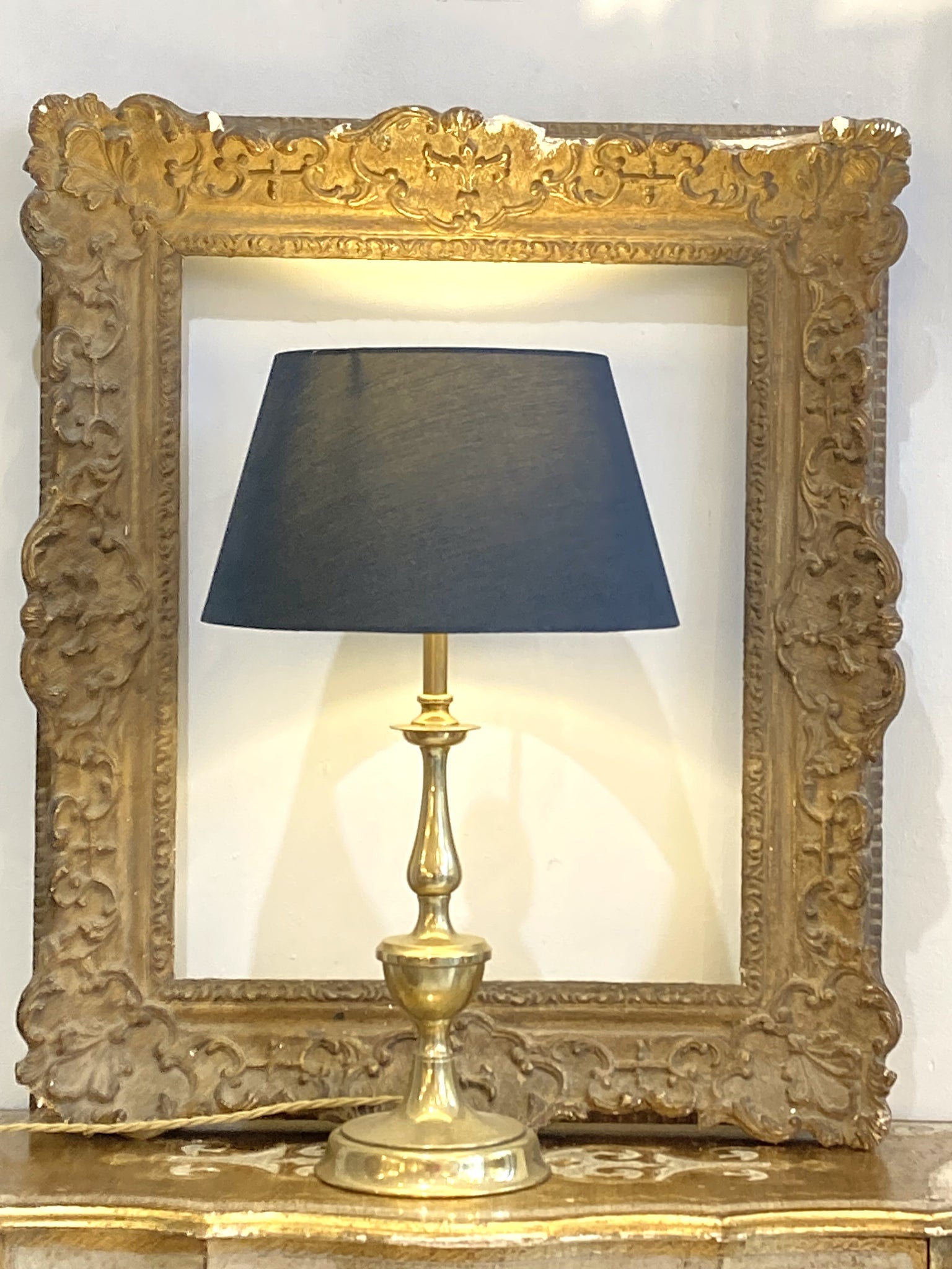 A classic vintage brass table lamp which has been rewired to current British specifications using fabric braided cord to compliment the age of the piece. Fitting is for bayonette LED bulbs and on/off switch is at the base of the bulb holder. Nice proportions and a good weight.
