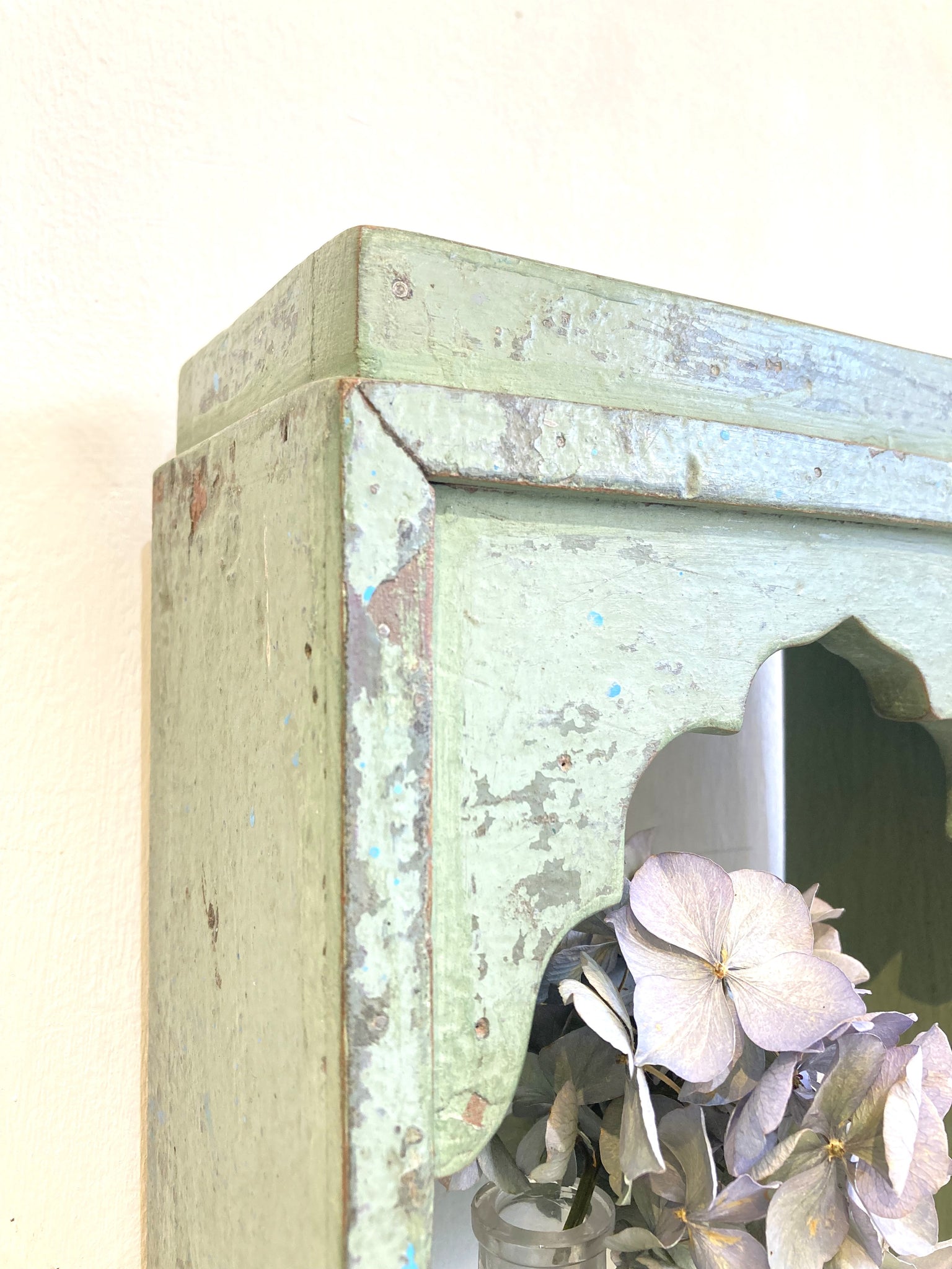 This sweet little pigeon hole shelf was made in northern India from reclaimed timber so retains the original pale green paint which has a lovely texture. The top of the pigeon hole has an attractive arched detail which is typical of the area it was made - perfect for displaying your favourite treasures!