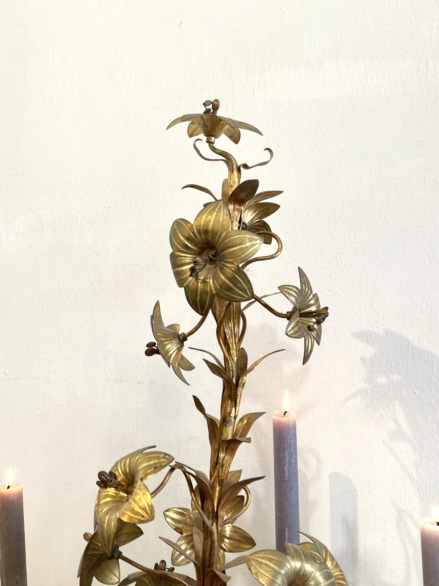 A spectacular pair of antique French brass 5 branch candelabra which would have originally be used in a church or chapel and decorated with the traditional lilies and leaves. Unlike any of the other pairs we've seen of these which are flat-backed, these are more like traditional candelabra which can be viewed from any angle. The scale is wonderful and they would make a fabulous statement on any dining or console table.