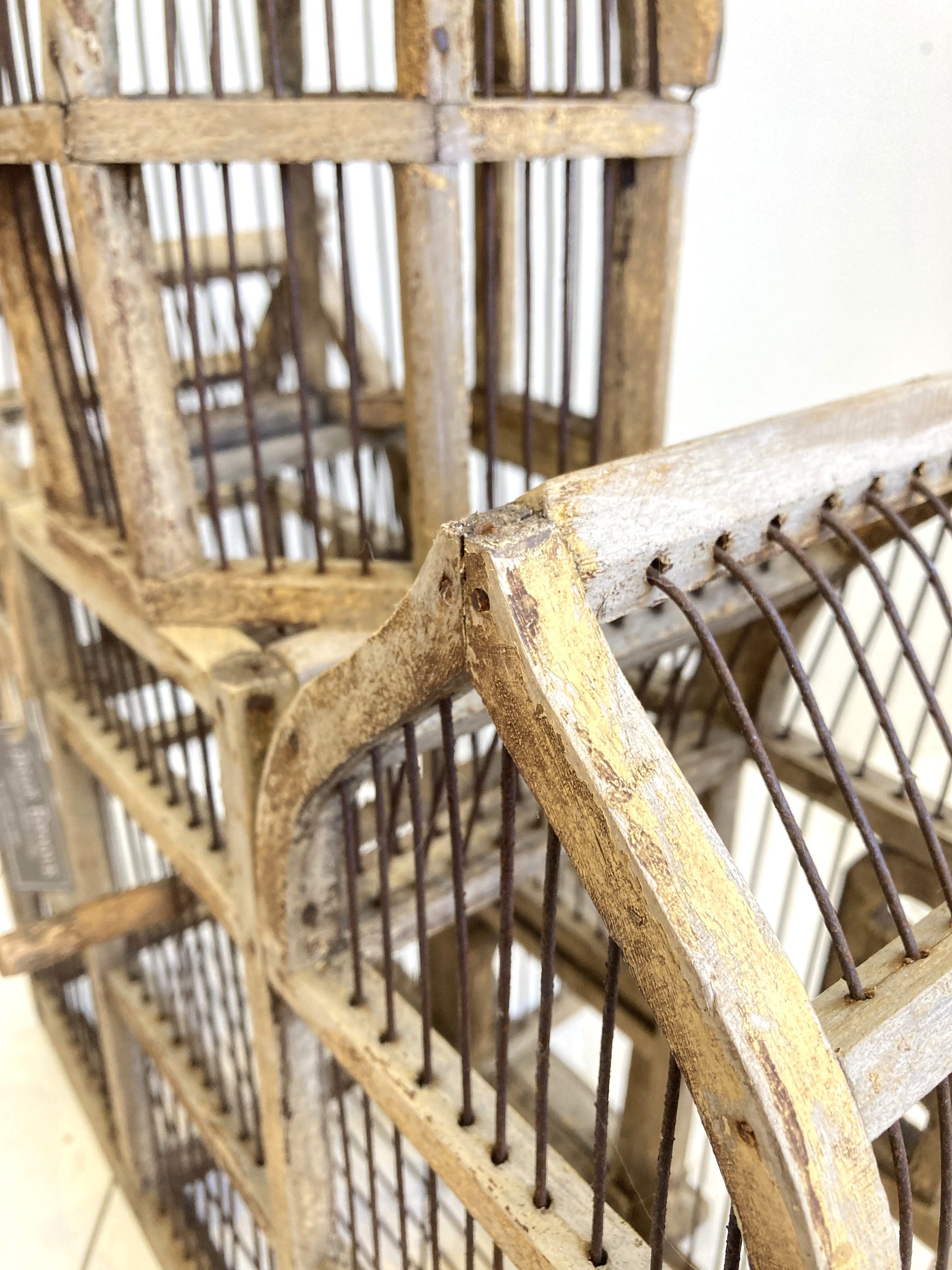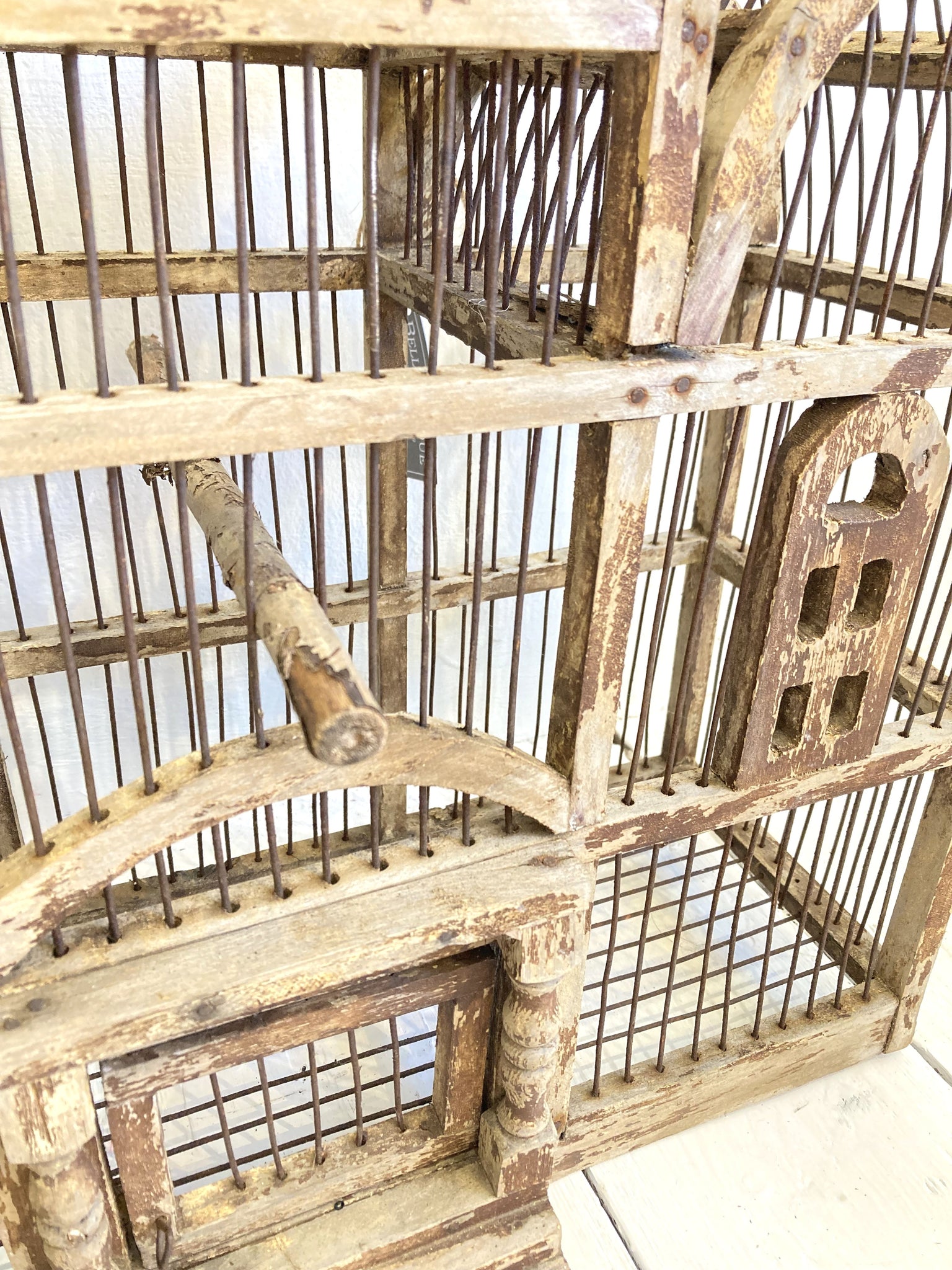 A striking vintage French architectural birdcage with a central dome and two side wings with arched tops, often referred to as 'cathedral style'. This is made from a wooden frame with metal struts and the frame has a lovely weathered finish. The central door has a swing latch opening and three little steps up to it (which is so sweet!). The perch is a later replacement.