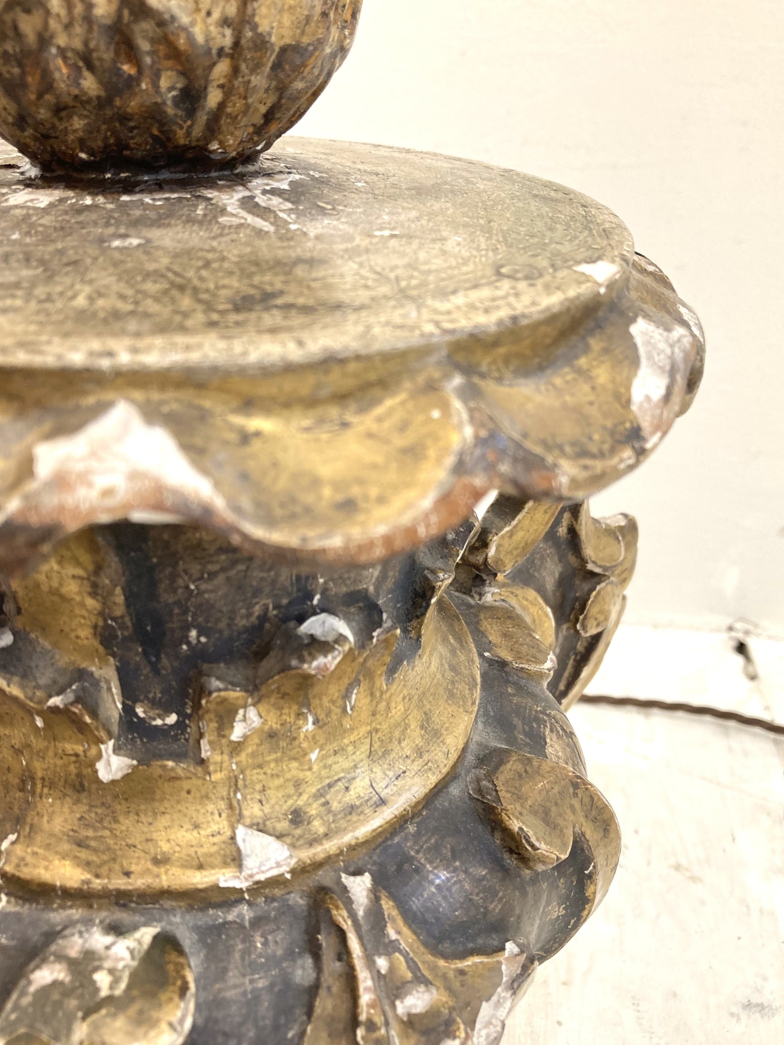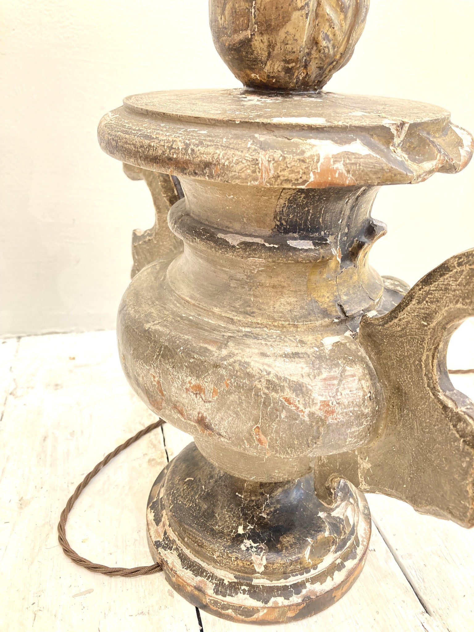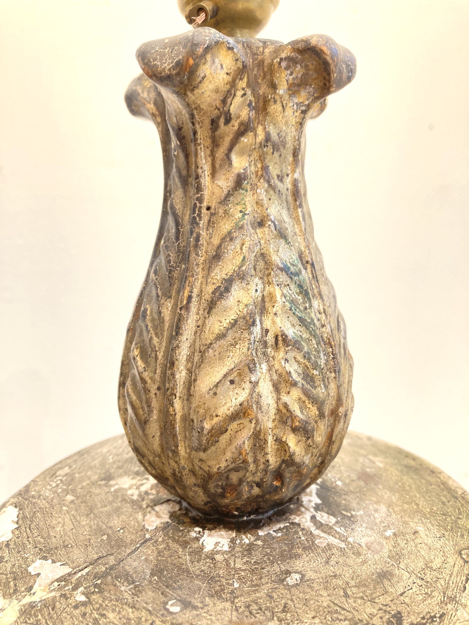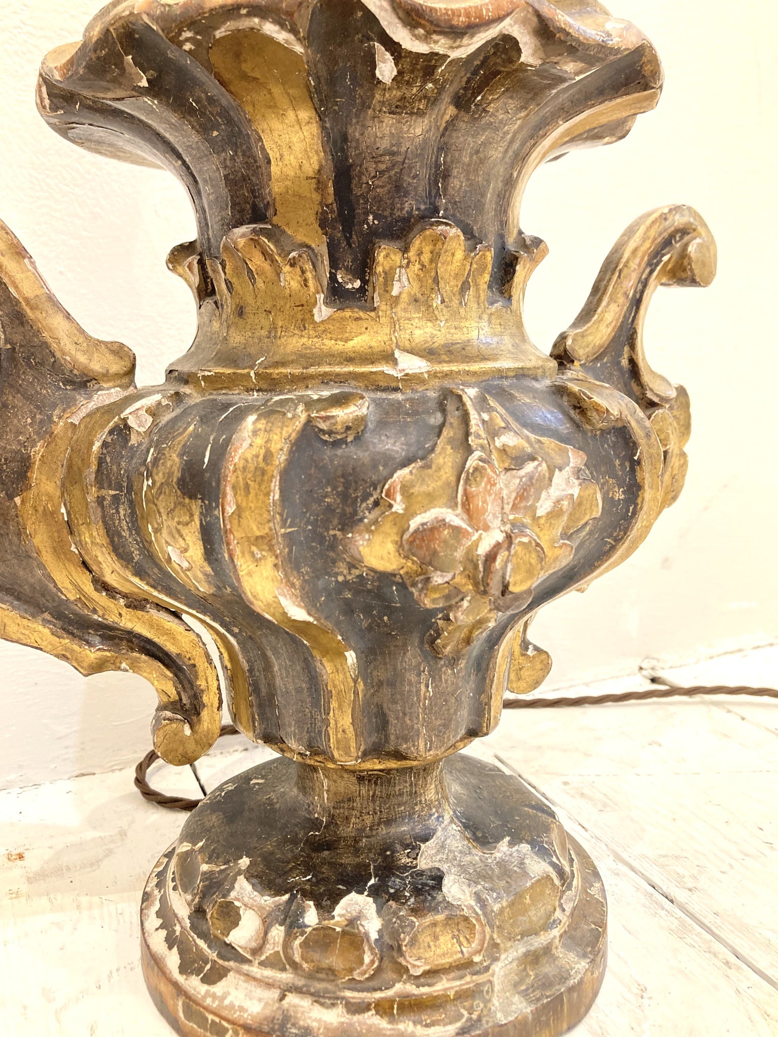 An absolutely stunning C19th carved black & gilt table lamp in a classical urn style - completely untouched, this has weathered and worn over the decades to this wonderfully textural, elegantly faded piece. The back is undecorated as it was originally - this was made to stand against a wall.