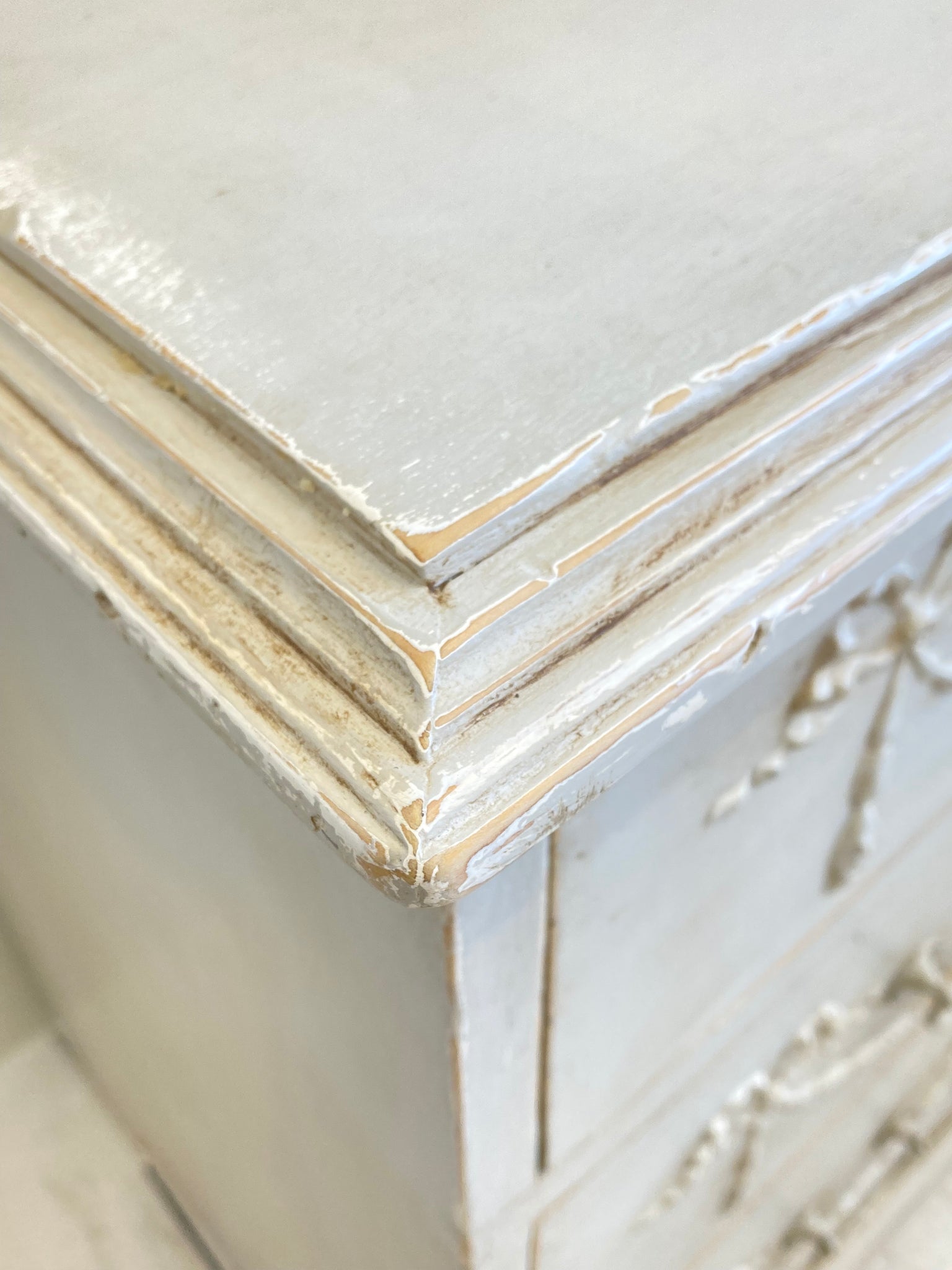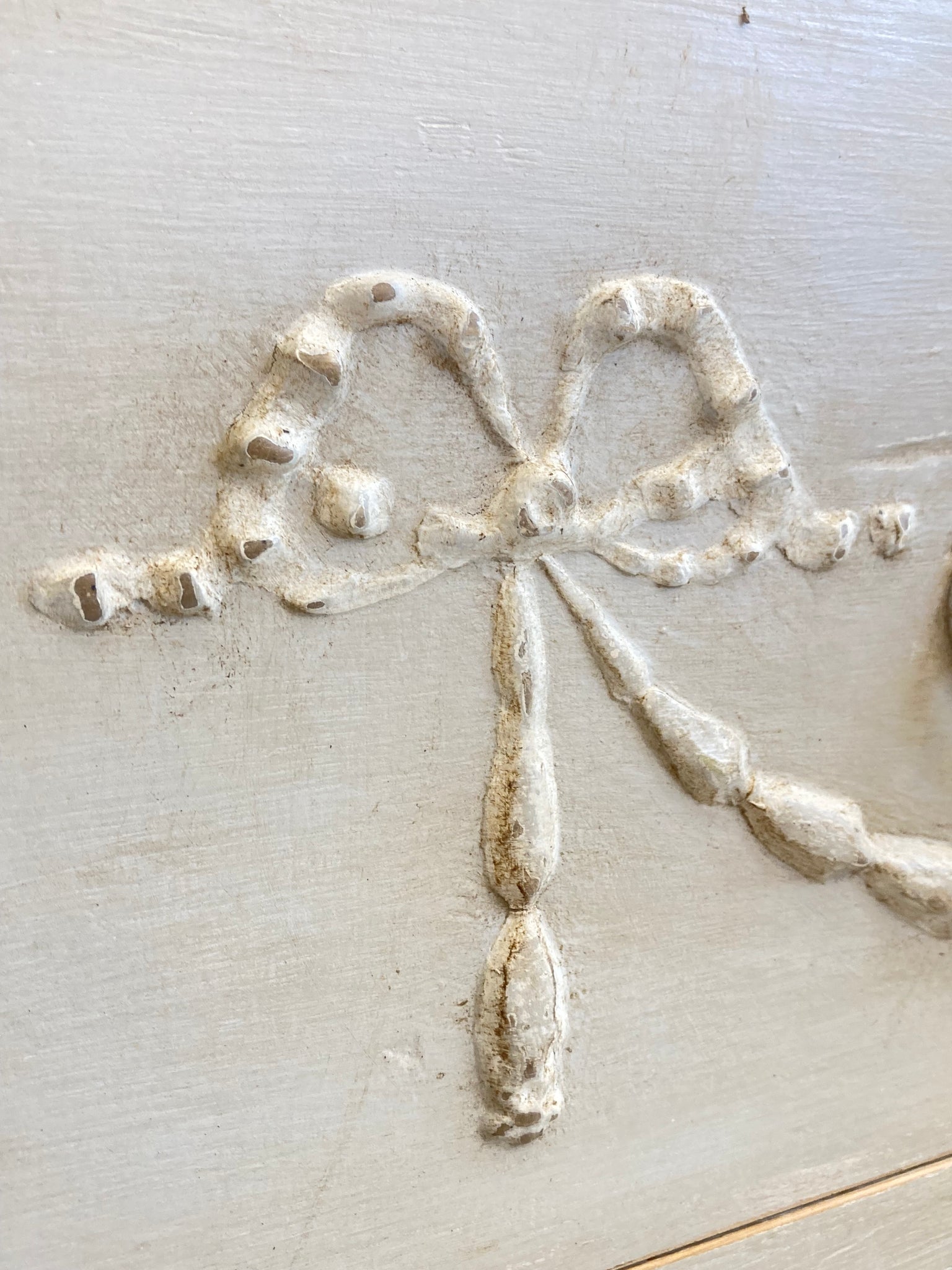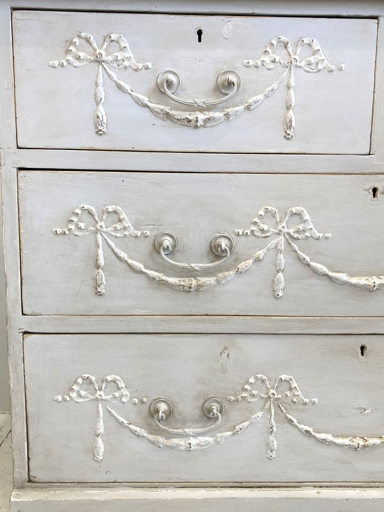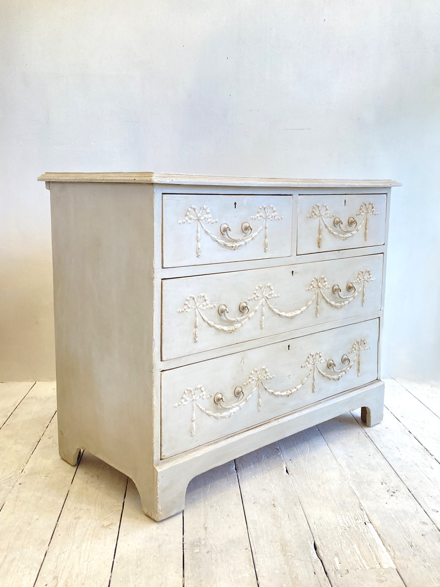 An absolutely beautiful late C19th pine chest of 2 short over 2 long drawers with the original classical swagged detail running across the drawers with the prettiest bows which we've highlighted in white against the pale grey body. Fully restored and running easily, this is as useful as it is decorative.