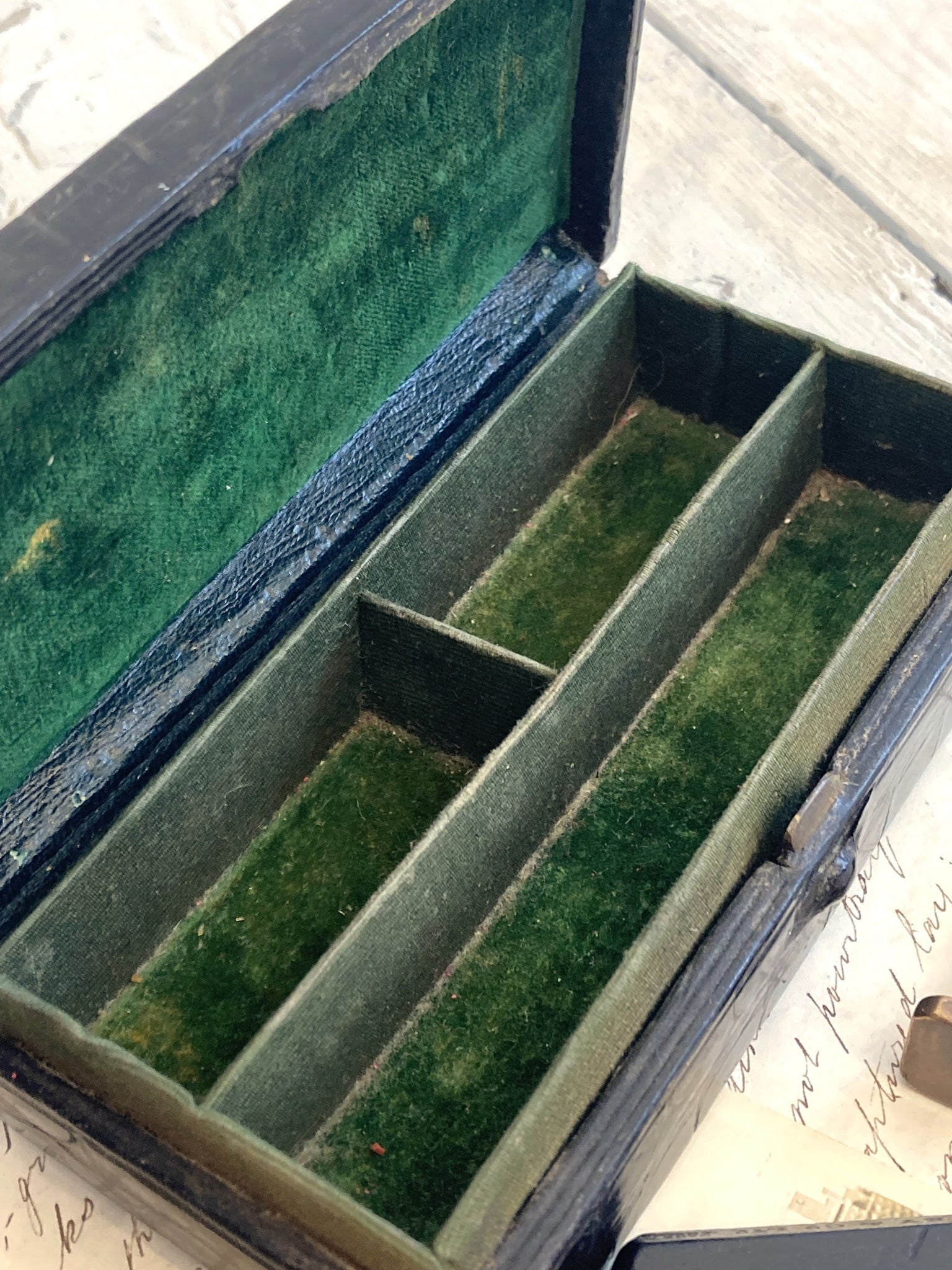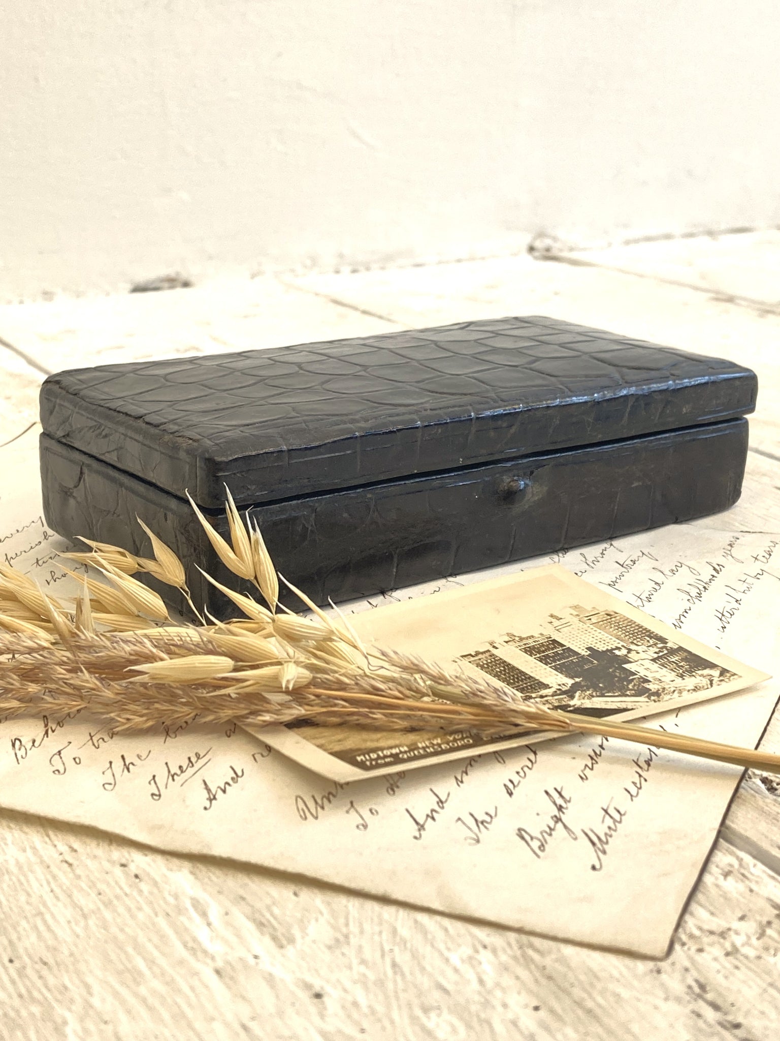 A handsome late 1800's black crocodile skin box lined with deep green velvet with little compartments in great condition with a little push button to open. It came to us with some sealing wax and a stamp which we're keeping with it but we thing that it would be perfect as a jewellery or cufflink box.