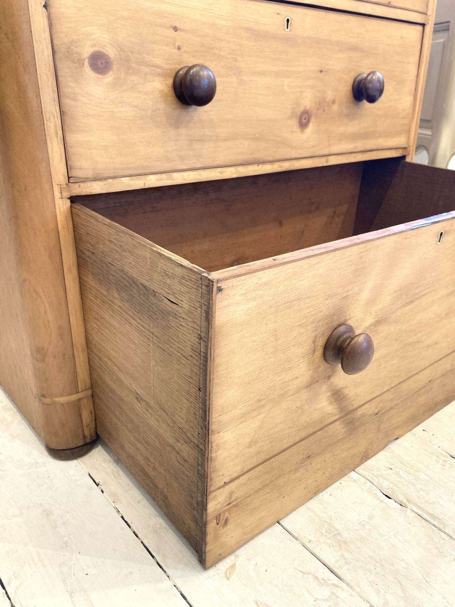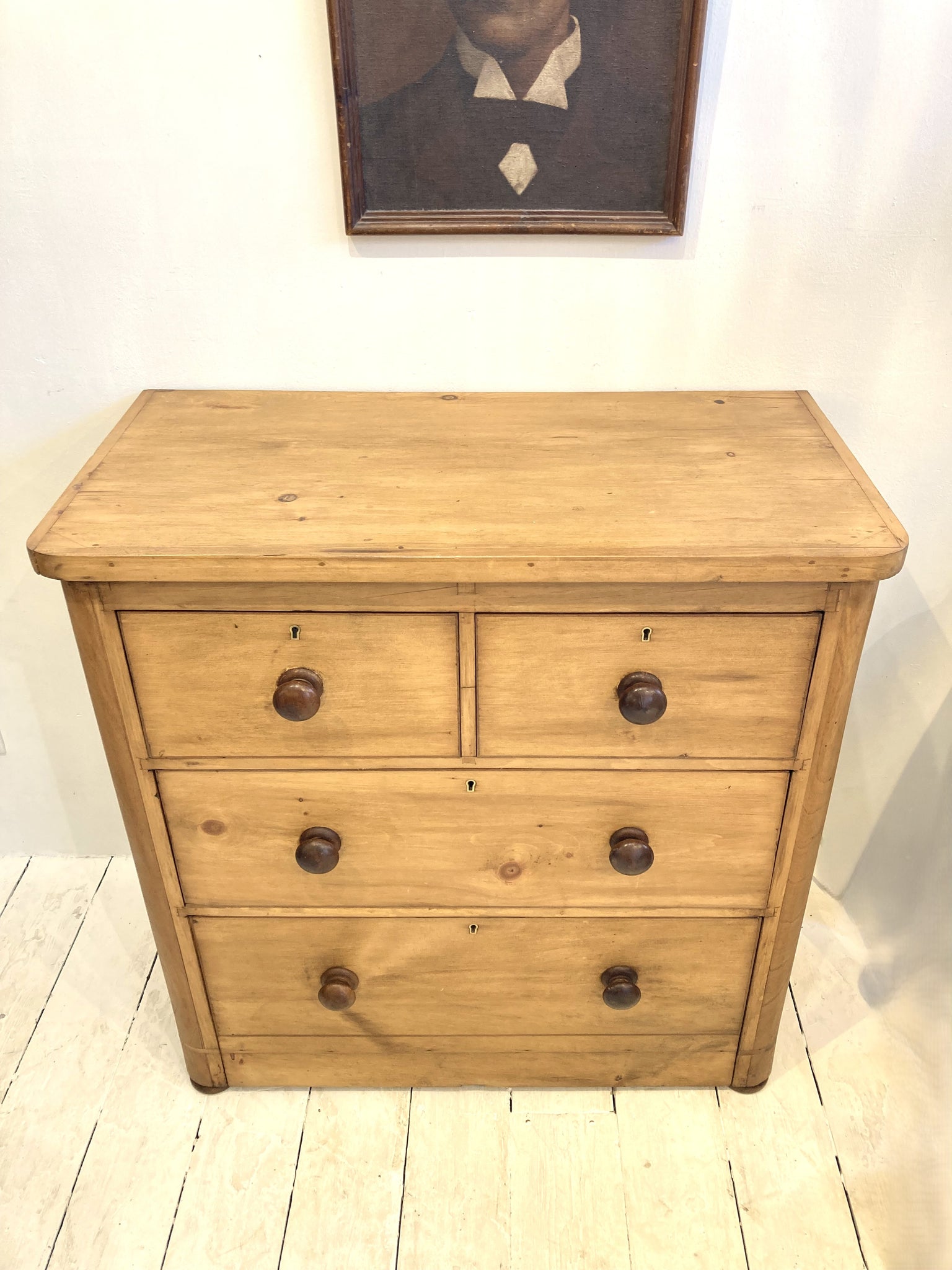 A beautifully proportioned C19th chest of 2 short over 2 long graduated drawers in excellent condition. This chest would have been originally veneered in mahogany and this has been removed to expose the pine underneath but keeping the original mahogany bun knobs which provides a wonderful, rich contrast. The base drawer is super-deep, perfect for storing jumpers and bedding! All drawers run well.