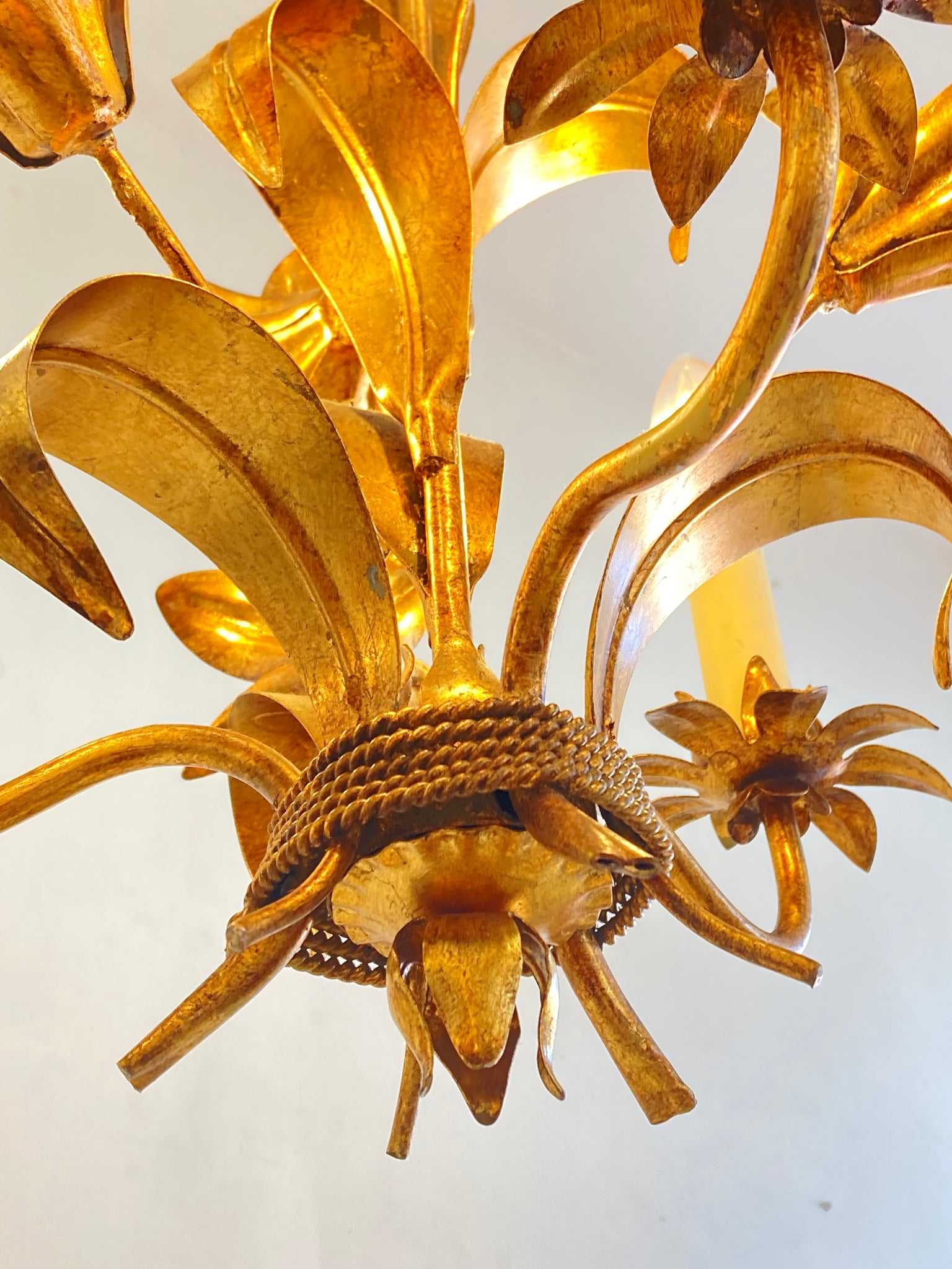 This light is based upon the French ecclesiastical candelabra that were commonly used in churches and chapels featuring cast lilies and leaves. With three arms, this has a lovely balance to it and is decorative and pretty without being overwhelming. There is a length of chain terminating in the original brass ceiling rose.