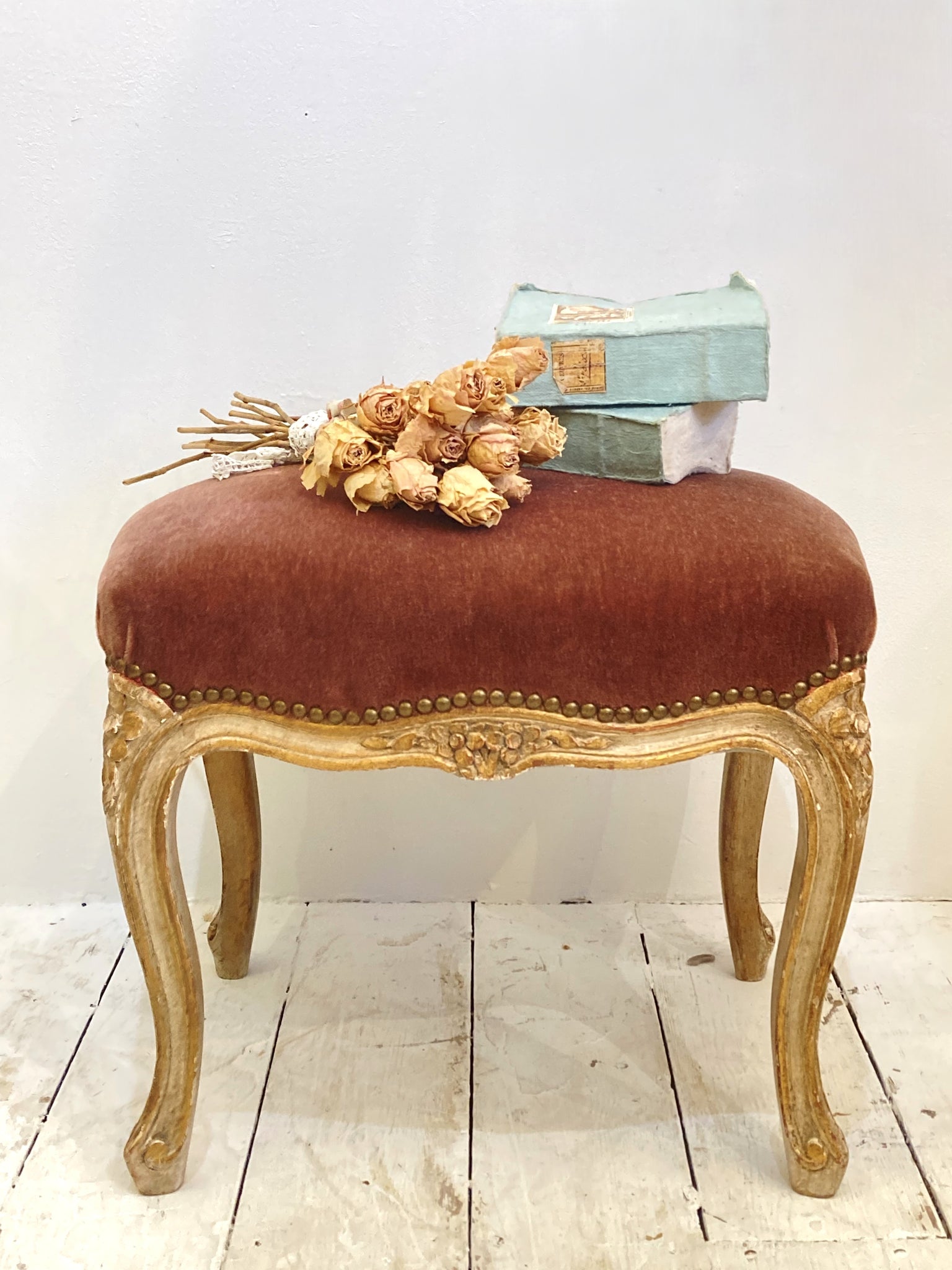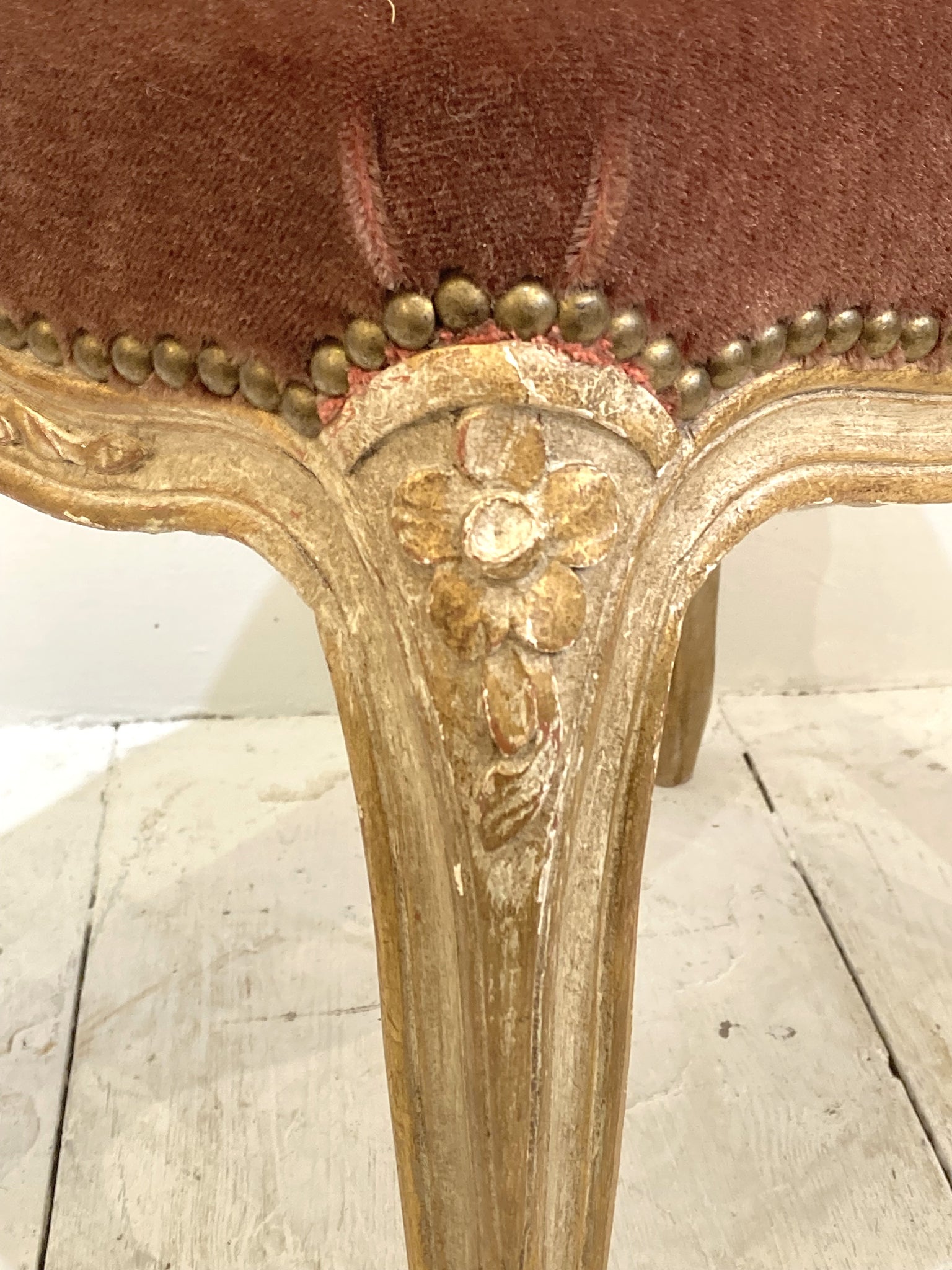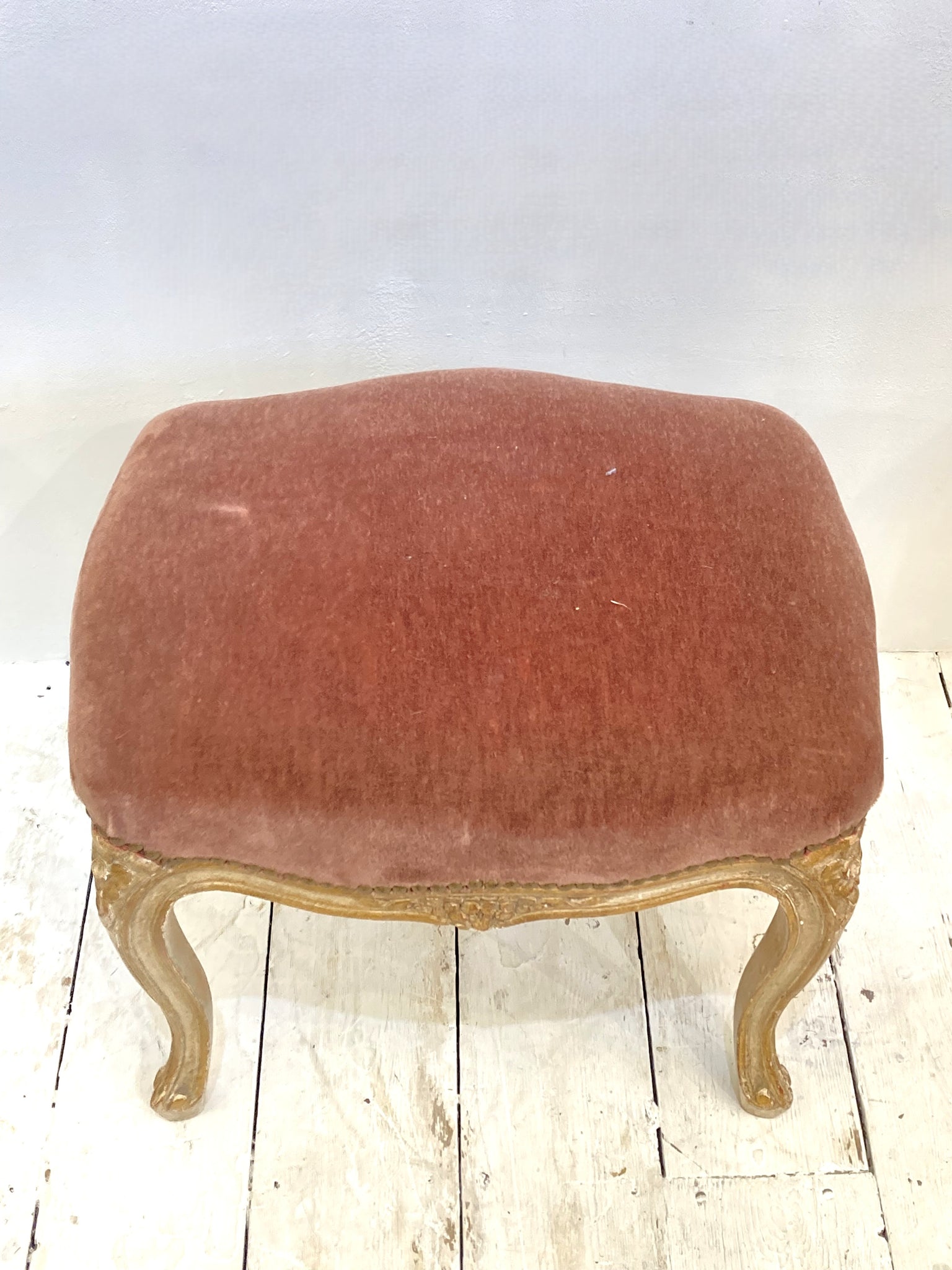 This very pretty French stool is both decorative and useful - in great condition, the webbing, springs and frame are all very solid & sound and the old velvet upholstery is still plush and a lovely raspberry colour. The frame is beautifully carved and the original painted finish is so decorative.