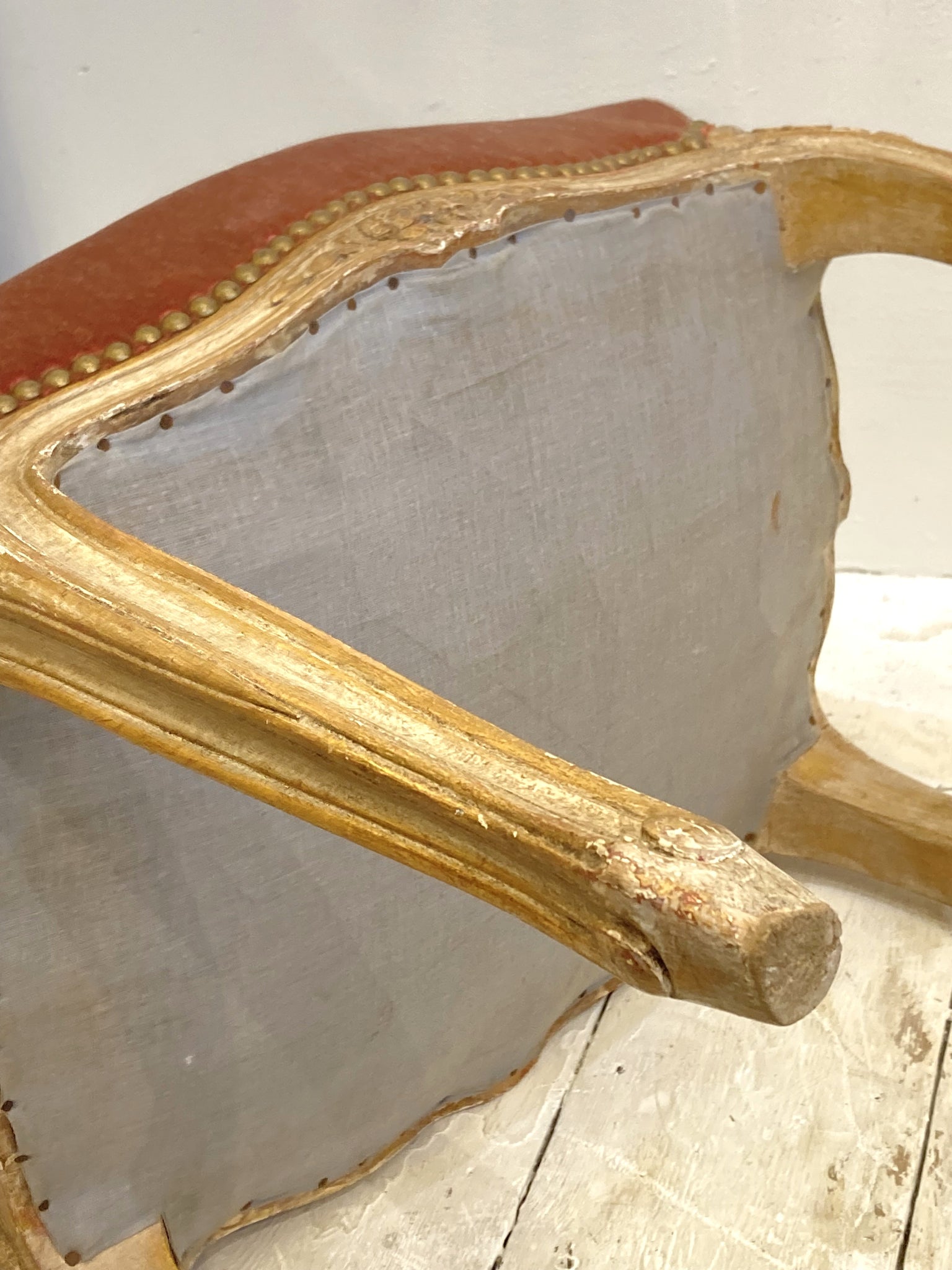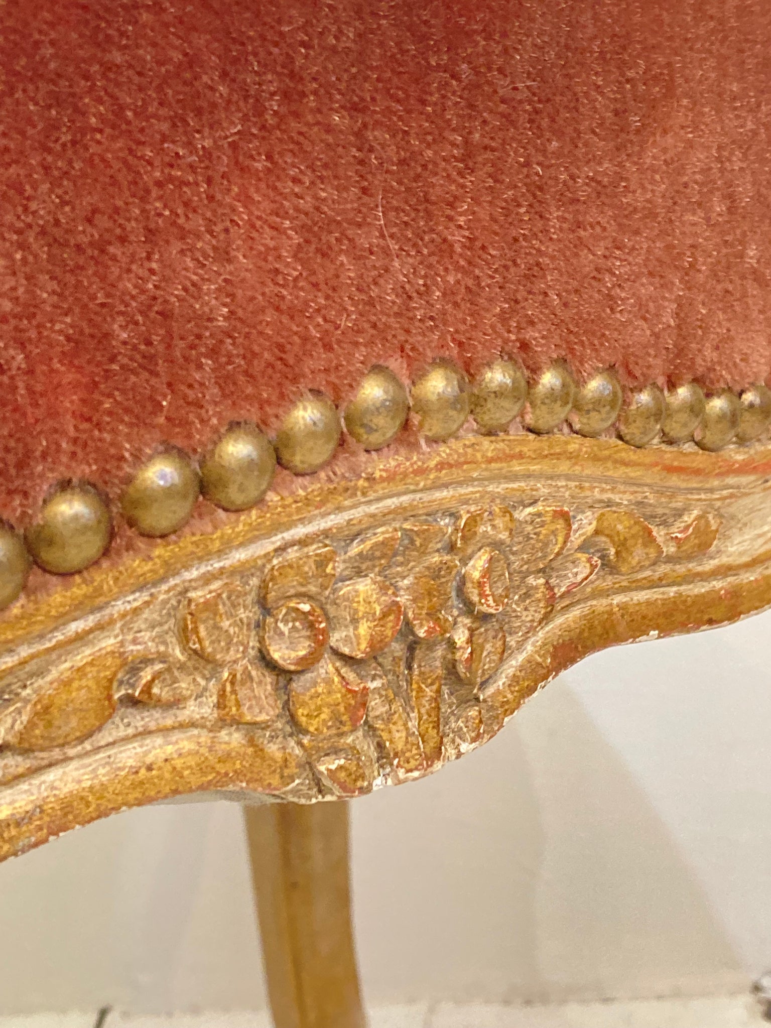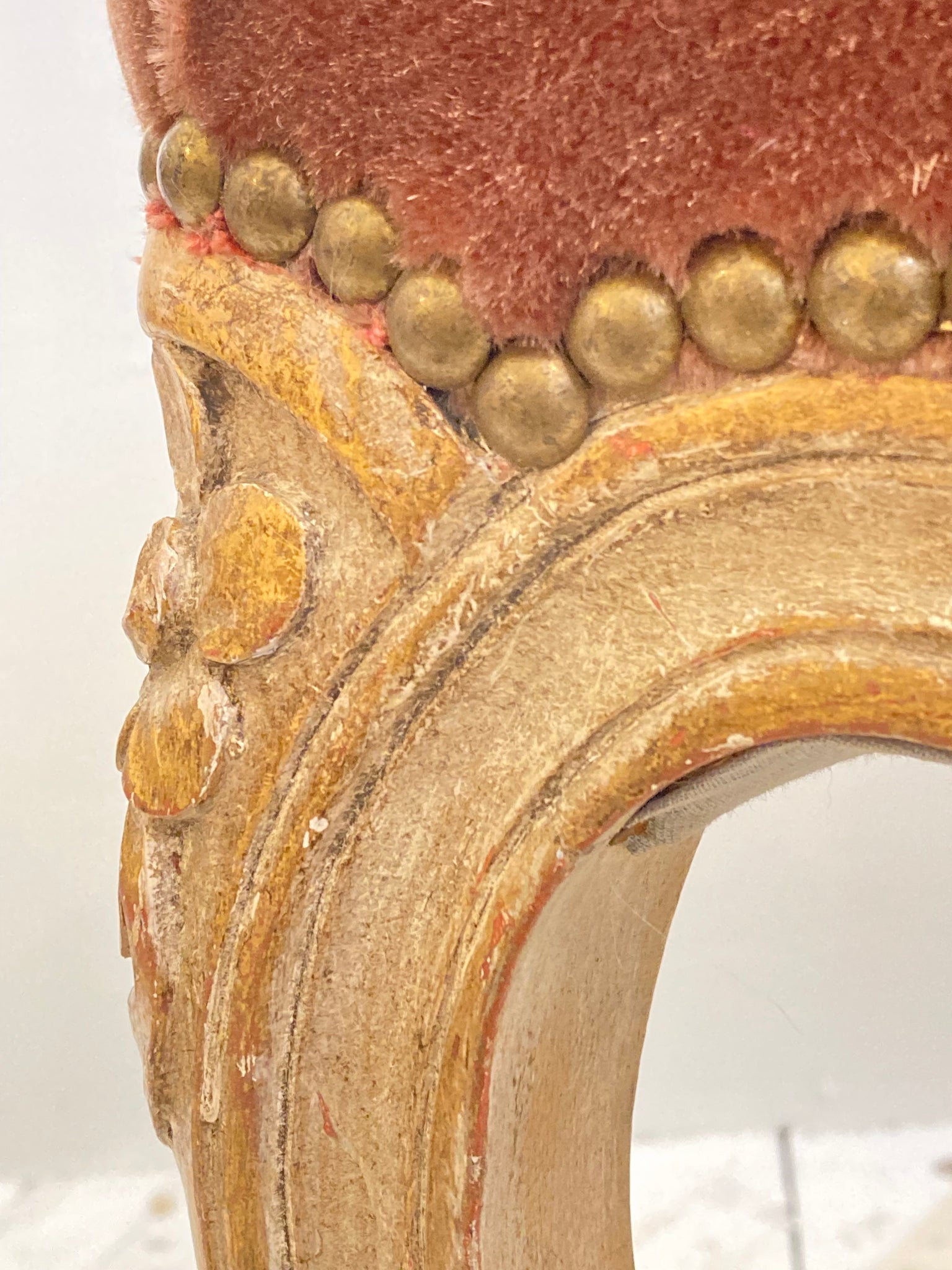 This very pretty French stool is both decorative and useful - in great condition, the webbing, springs and frame are all very solid & sound and the old velvet upholstery is still plush and a lovely raspberry colour. The frame is beautifully carved and the original painted finish is so decorative.