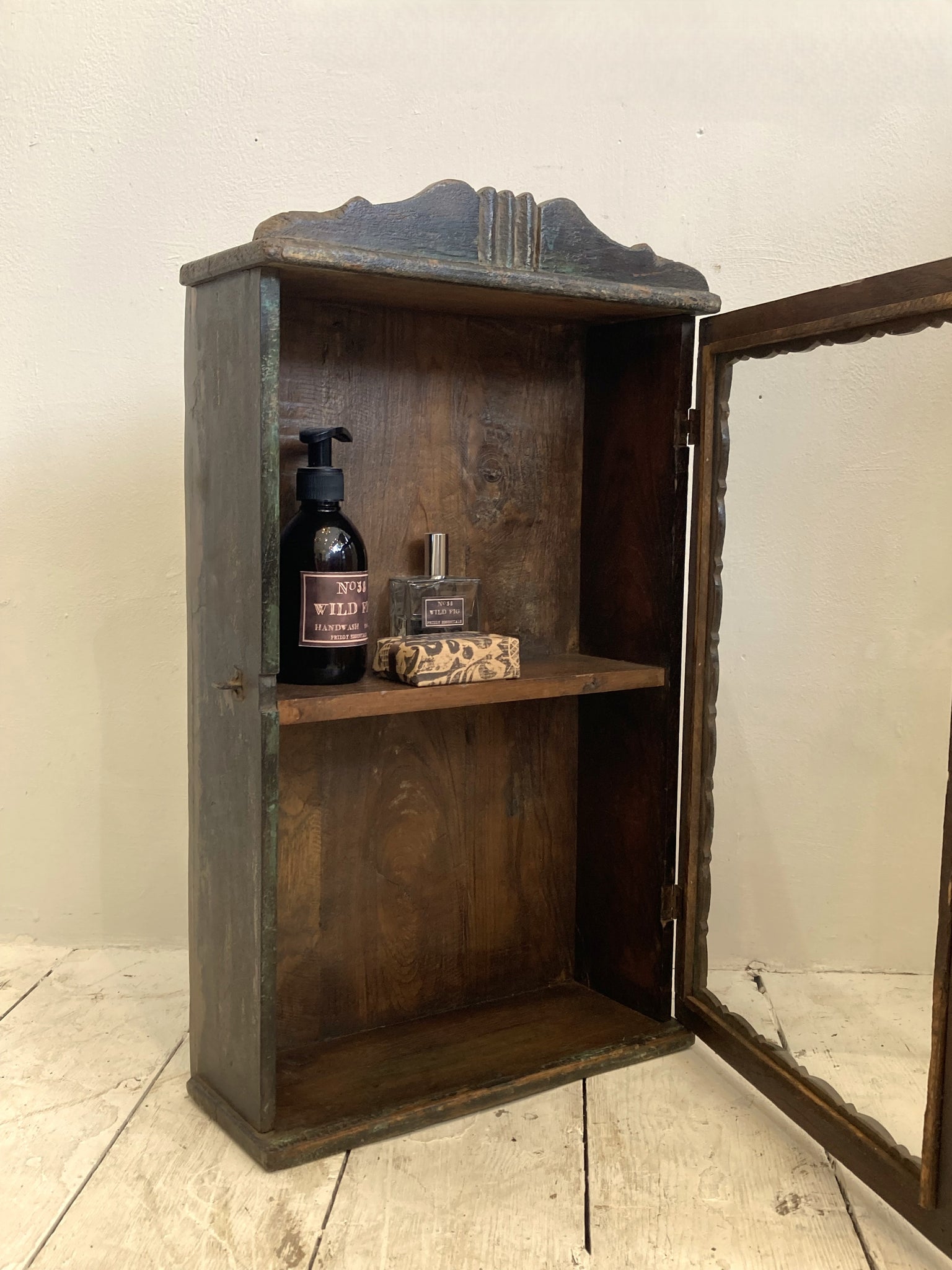 A great sized little Indian cabinet with glass door and single internal shelf. The cabinet has layers of original paint including green and black giving it a wonderful textural finish. The door secures with a latch on the left hand side and there are two hanging eyelet on the back.