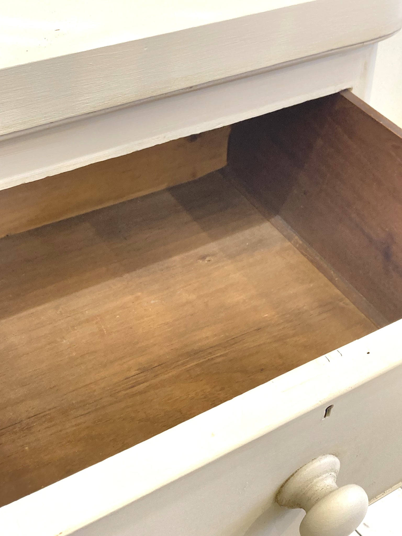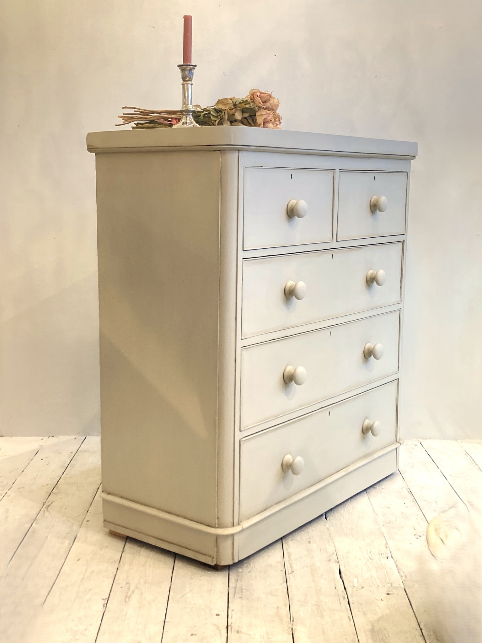 This beautifully proportioned antique mahogany chest of drawers has most fabulously deep and capacious drawers, especially the bottom 'boot' drawer which would be great for storing jumpers, linens, bedding etc. The drawers are graduated and all have their original bun knobs and dust runners, we've fully restored this chest so the drawers run easily. Painted in Little Greene Paint Co 'Portland Stone' which is a soft neutral.