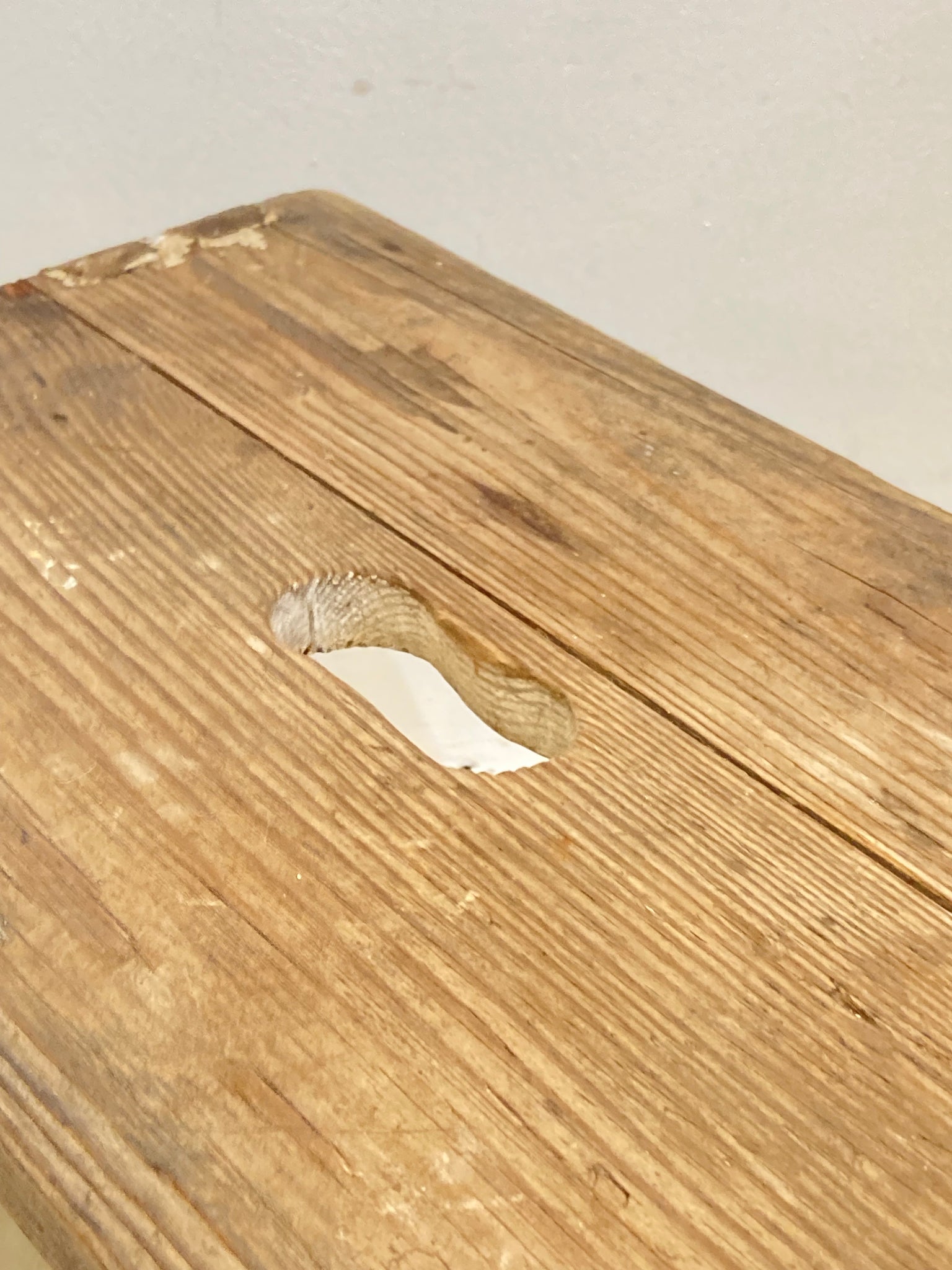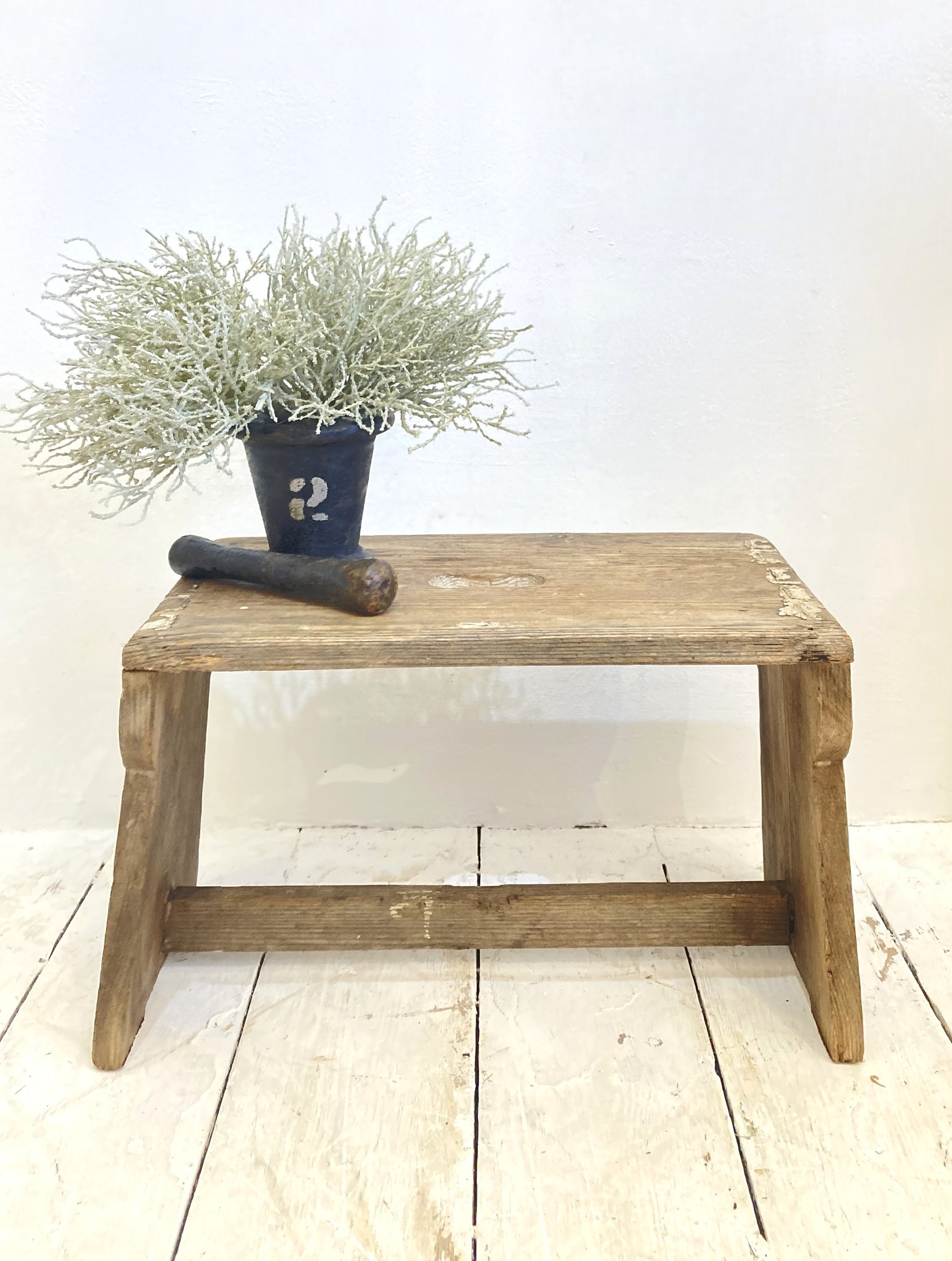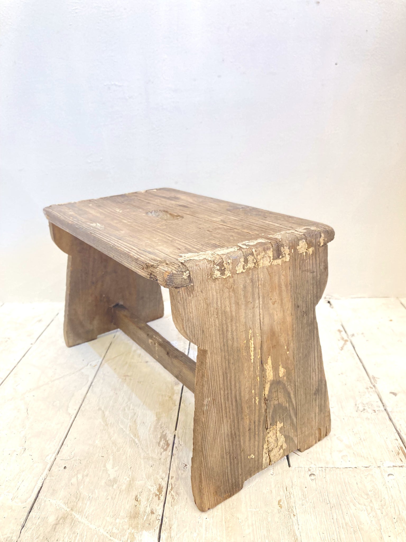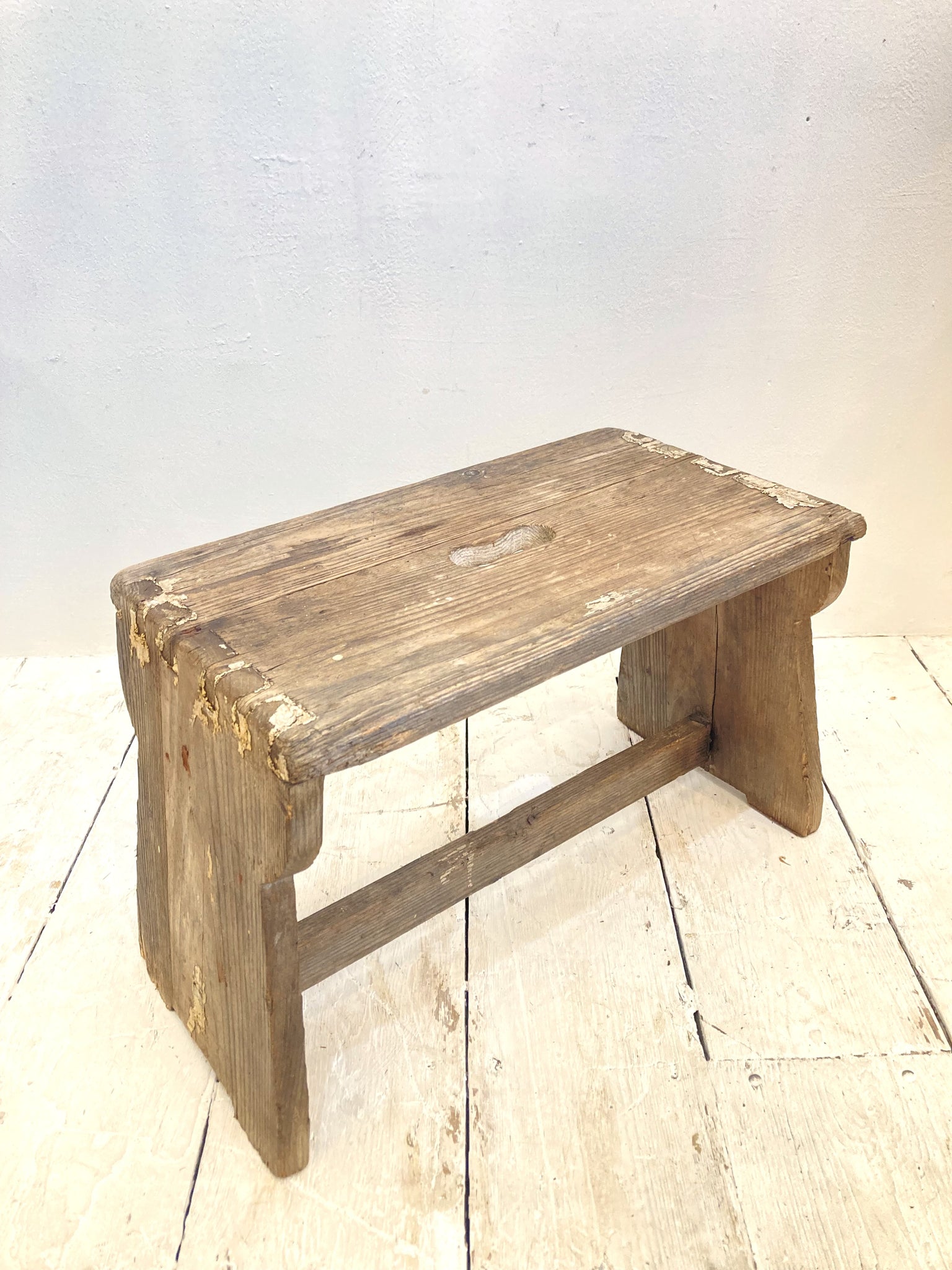 A beautifully rustic old step-stool with hand-hole and nicely shaped sides. Structurally sound and with some of the original old white paint, this is a great size for a little side table too!