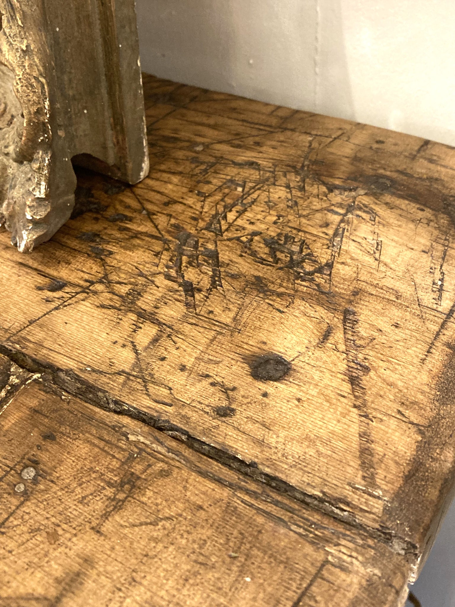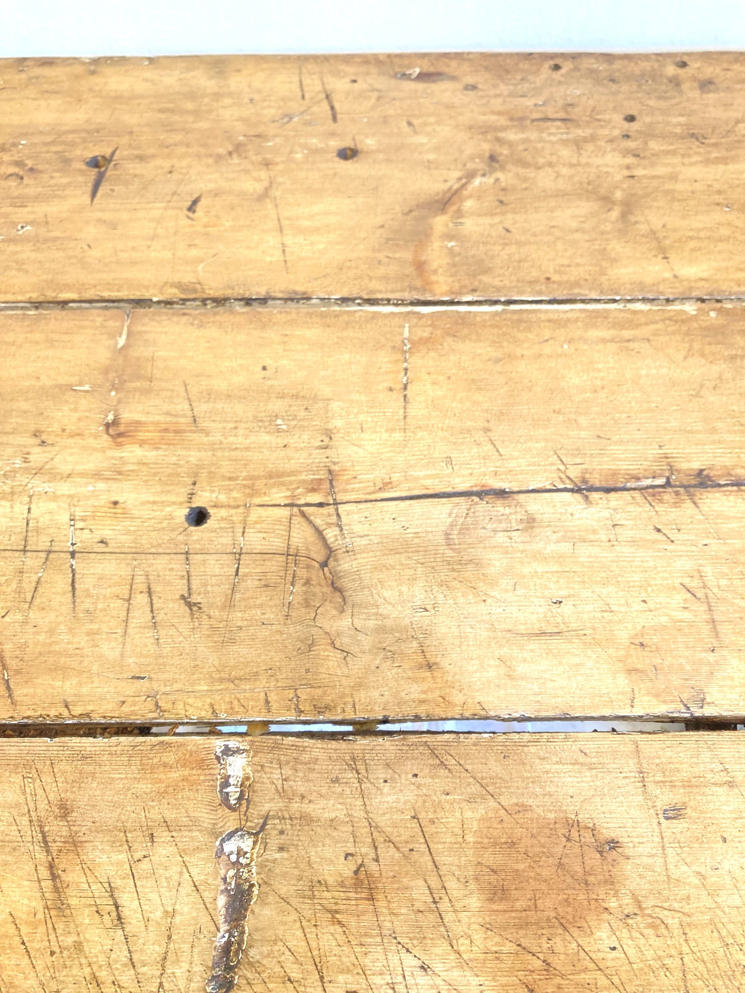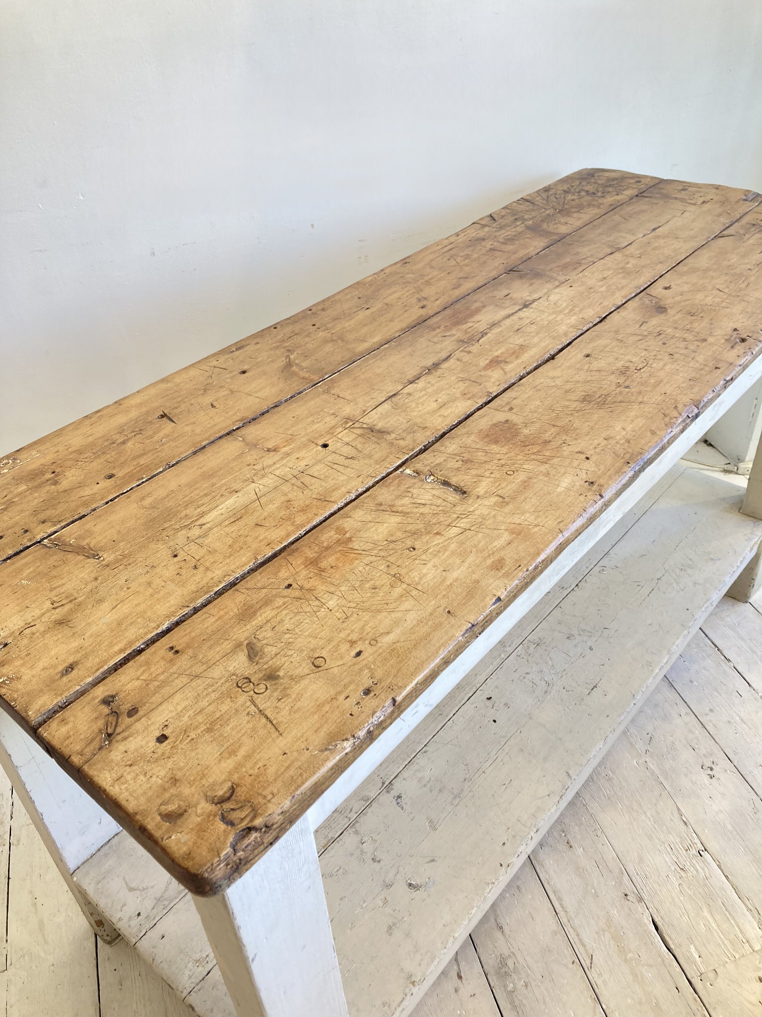 A really handsome C19th Victorian prep table with a fabulously characterful pine top and painted base with lower tier. The paint work is weathered and perhaps may benefit from a refresh but this does seem to work as it is.... The top shows plenty of signs of life & age and the planks have shrunk over time which has left small gaps between them. This would be perfect as a large console table, kitchen prep table or workbench or even a kitchen island?