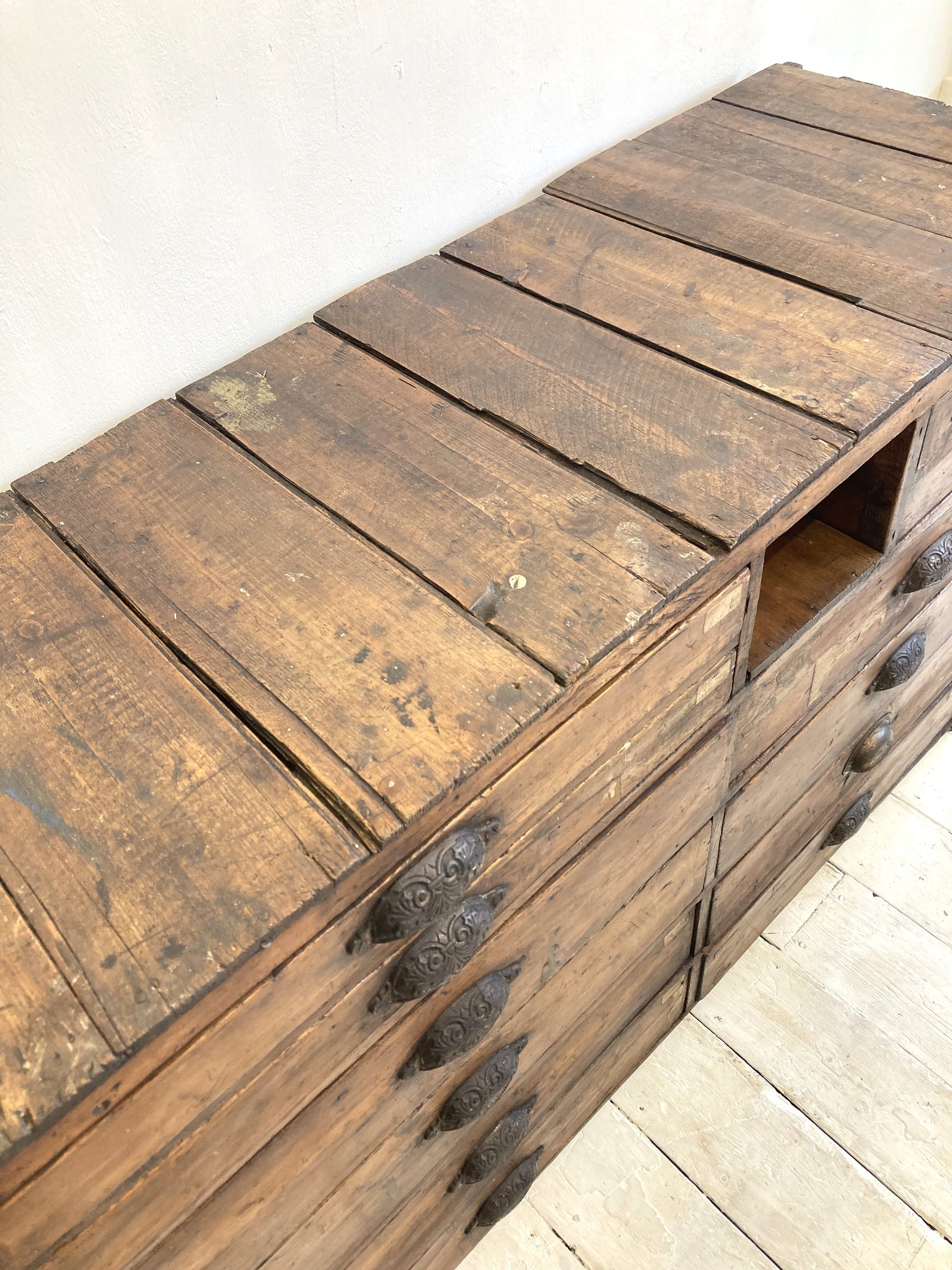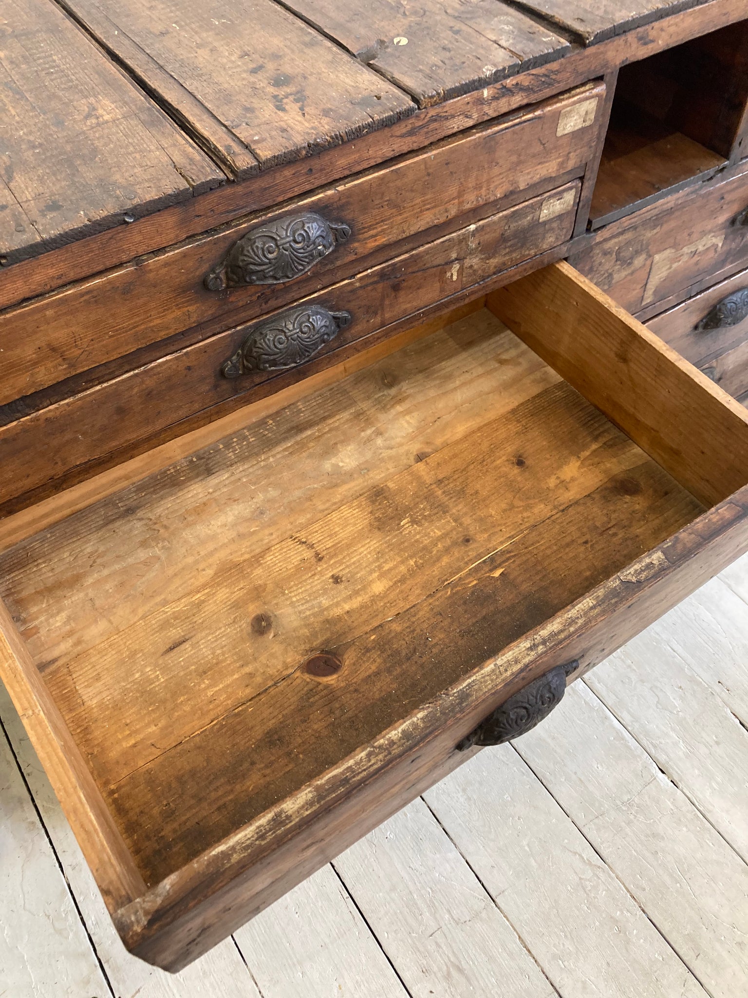 A beautiful set of C19th workshop drawers with a deep, dark colour and great industrial look. The top two left hand drawers have internal divisions; the original cup handles are decorative and nicely cast (there is one replacement on the lower right hand side). All drawers run well and have working runners, guiders and stops and the chest stands stable & even.