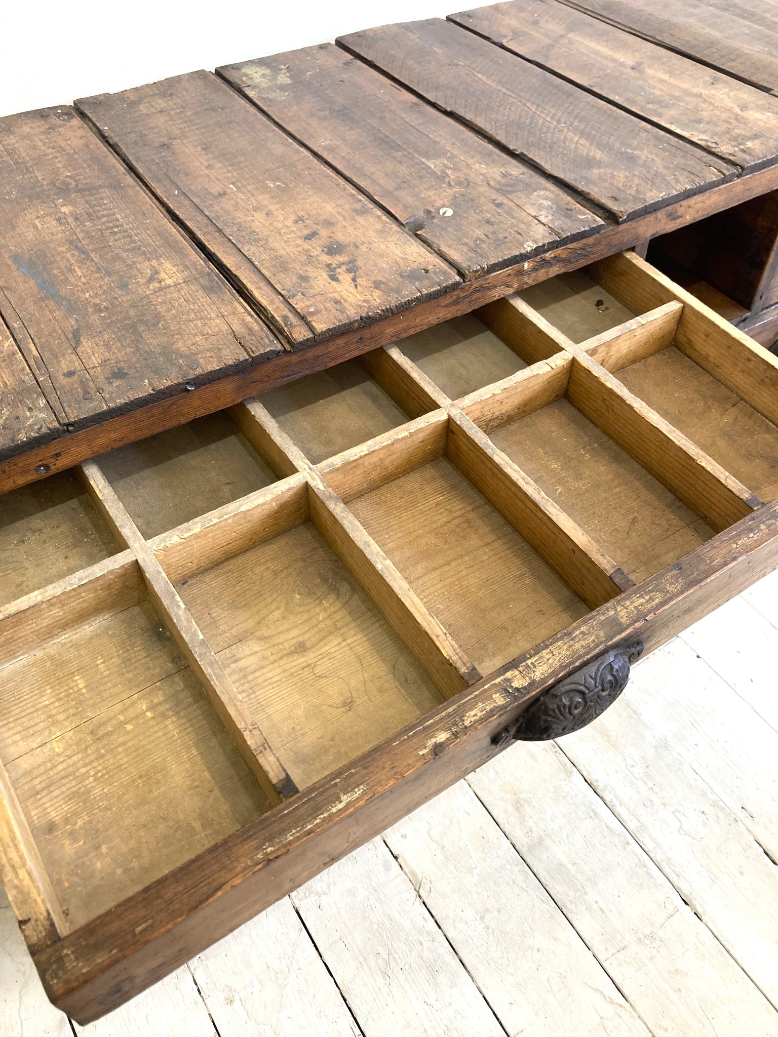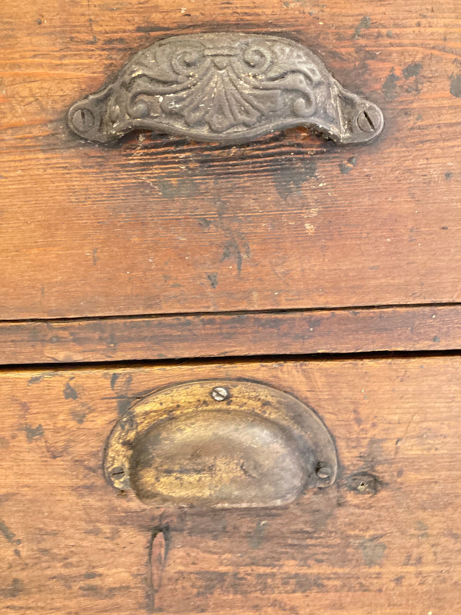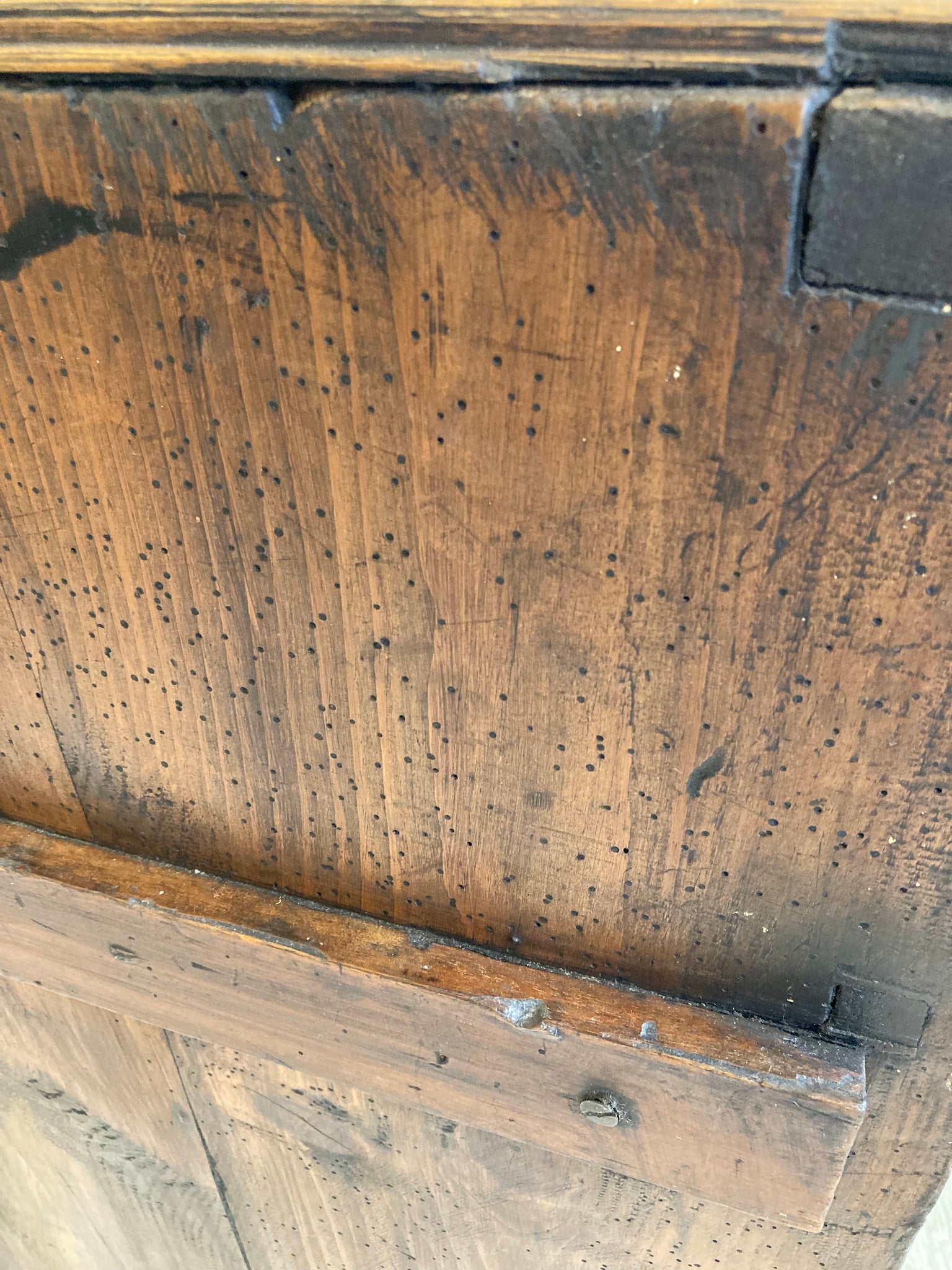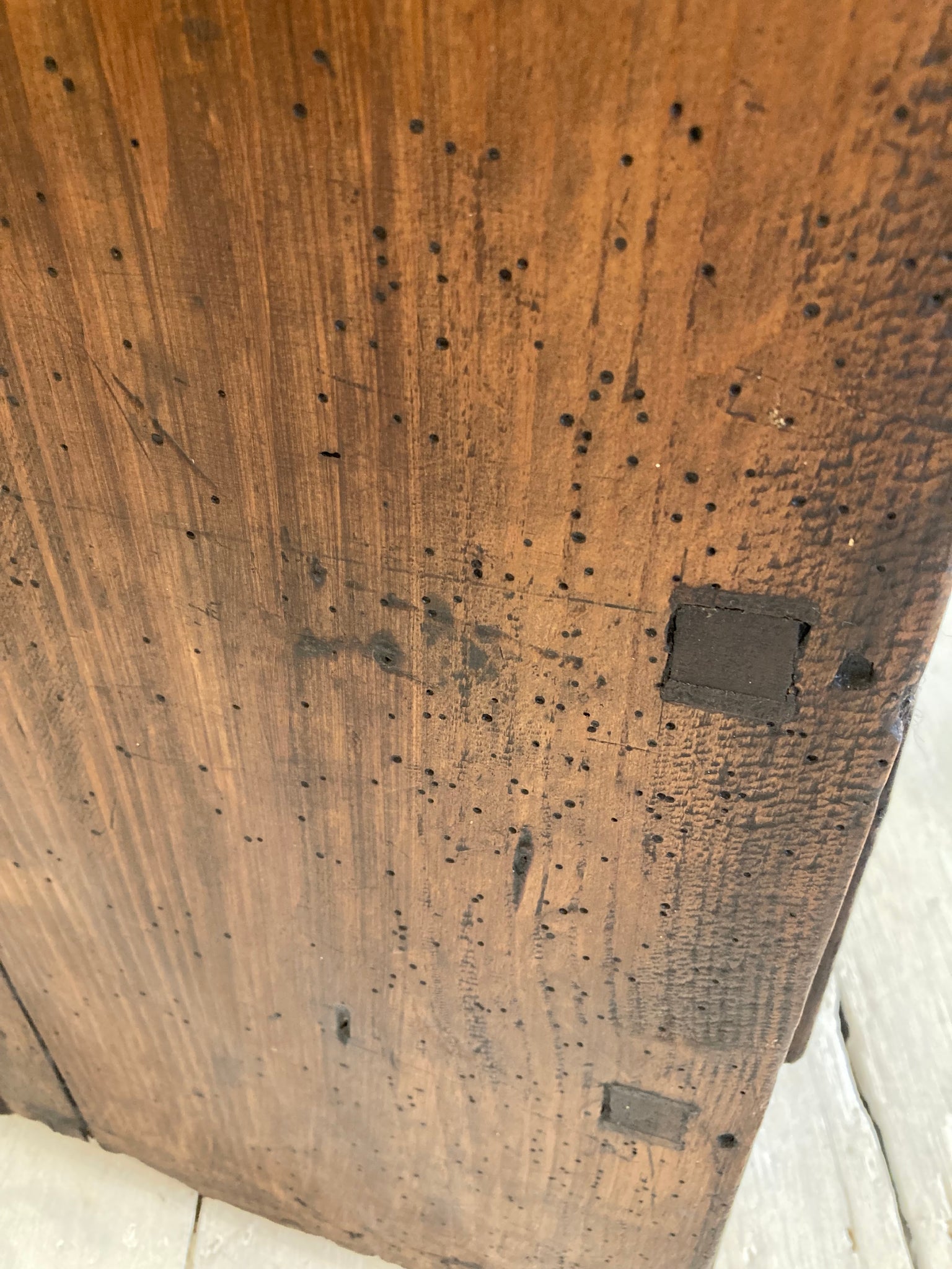 Whilst being striking and fully functional, the drawers are in a rustic condition - please take the time to look at the photos carefully as they are a true representation; there is the replacement handle (already mentioned), both sides have suffered badly from woodworm in the past - this has been thoroughly treated and the top is of a simple plank construction.