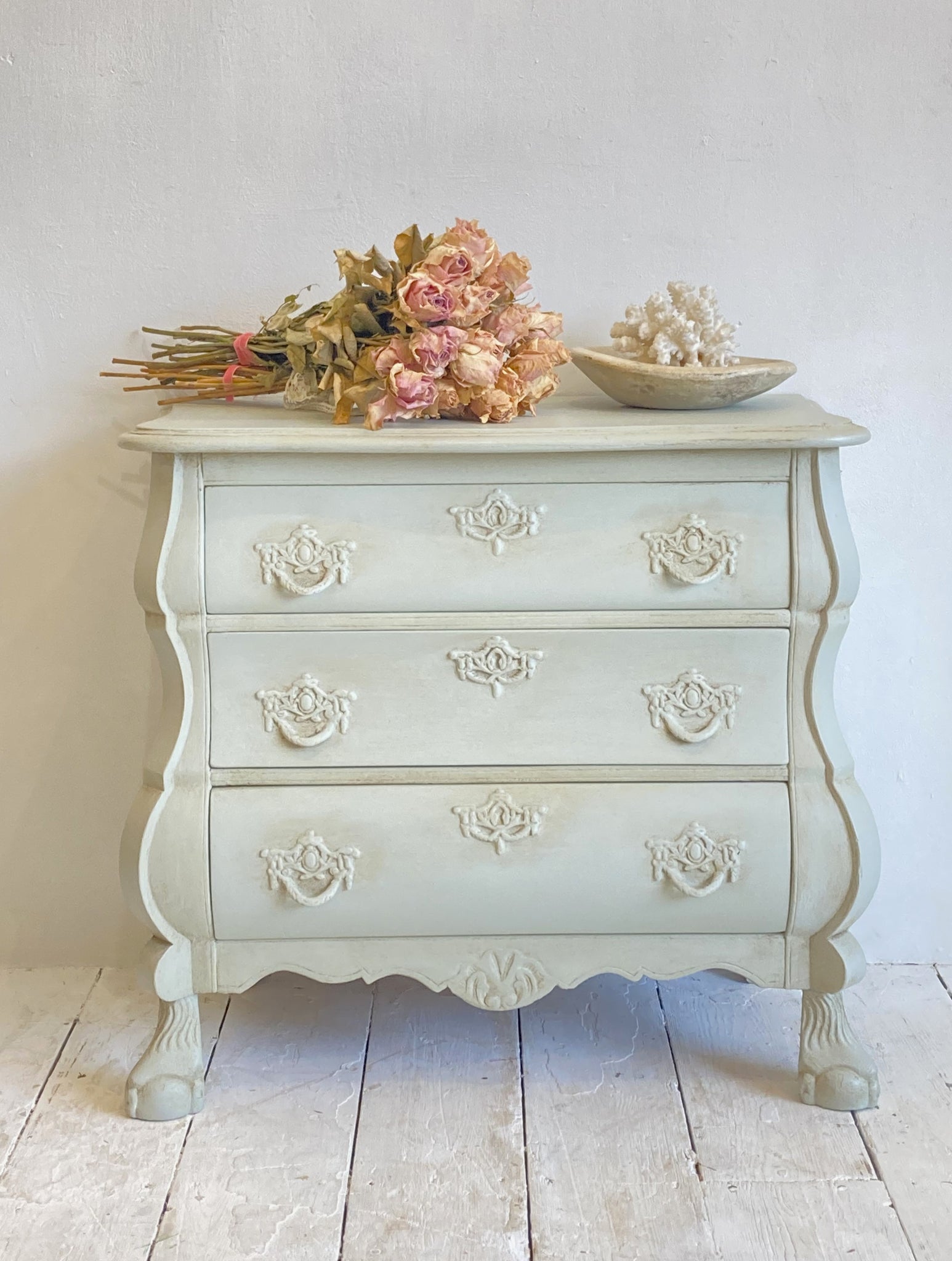 A very pretty vintage oak bombe chest with three drawers and a wonderful serpentine shape. Standing on ball & claw feet, this chest is so decorative with pretty cast handles & escutcheons. Painted in Little Greene Paint Co 'Tracery II' which is a soft green-grey. This is a near-pair to Bombe Chest B which we currently have listed.