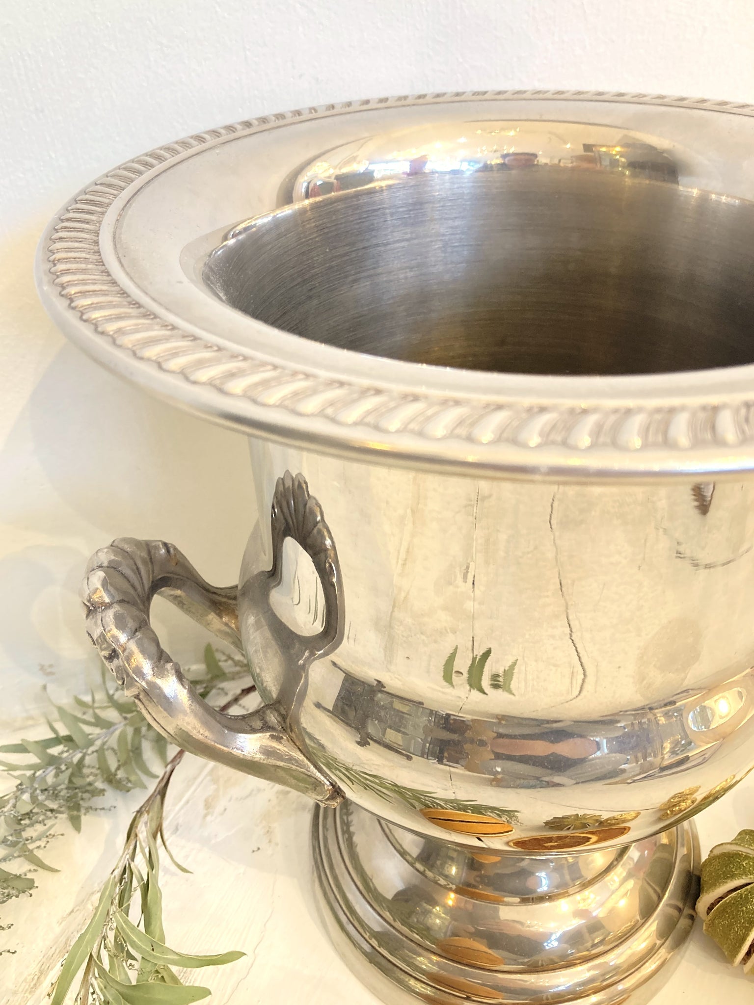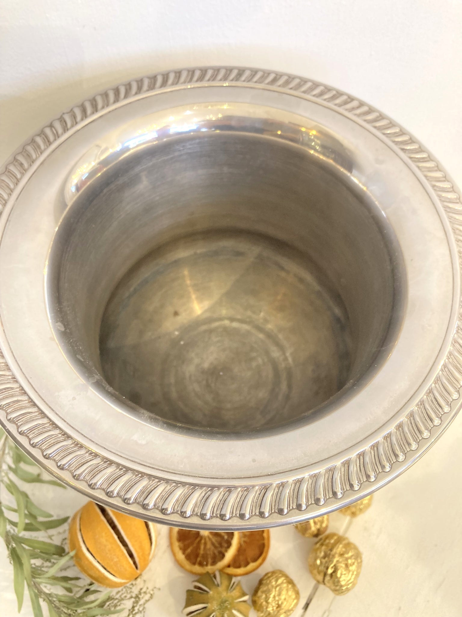 This handsome vintage champagne bucket is in the traditional urn form with gadrooned decoration around the rim and ornate handles on either side. In very good condition, this would be a wonderful gift or addition to your home bar or cocktail trolley! Silver plated.